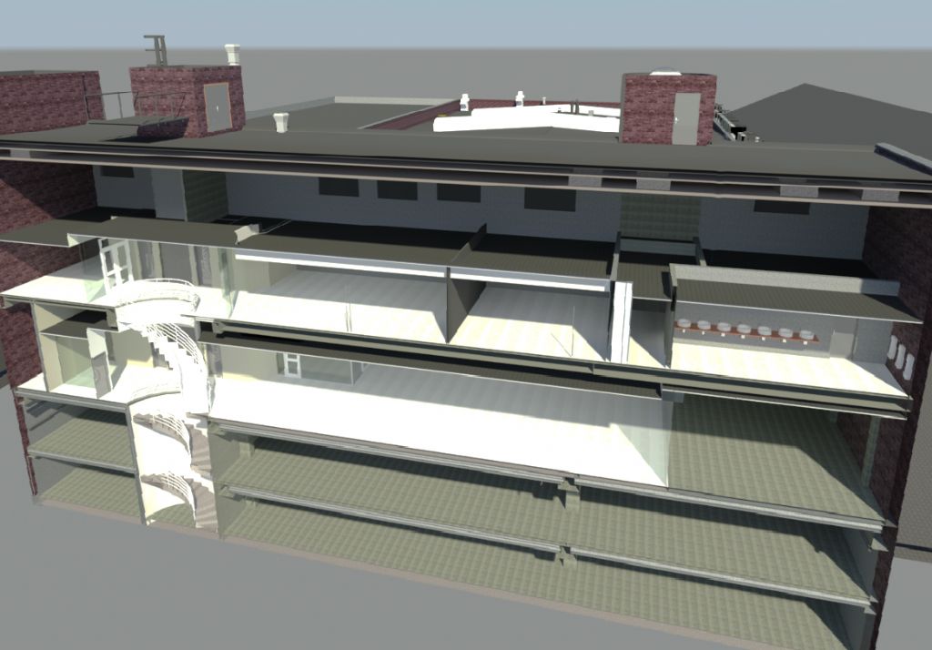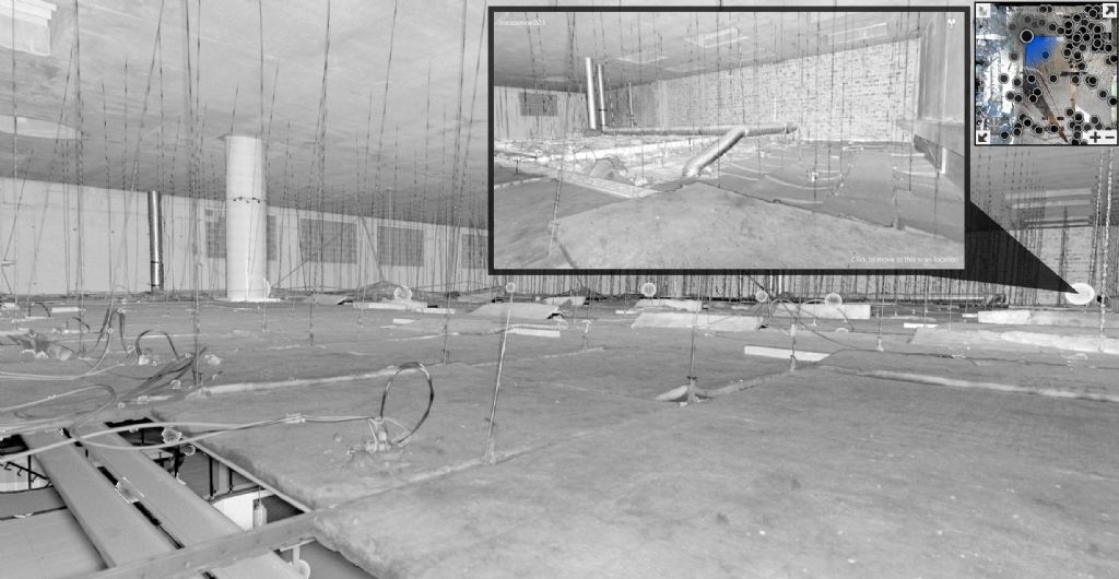 Le bâtiment s'étendait sur 4 niveaux + toiture + facade + environnement extérieur. La surface totale à traiter était d'environ 16 000 m2 , avec un niveau de complexité élevé : faux-plafonds et parois de recouvrement multiples. 268 scans ont été nécessaires pour couvrir l'ensemble, ce qui a nécessité 5 jours de travail. Il a fallu ensuite 3 semaines pour la modélisation complète en tant que « plan as built ». Les logiciels utilisés : « Scène » pour l’assemblage des scans - export du nuage de points en « Recap » - Dessin/modélisation dans « Revit » avec Plug-in « PointSense ».