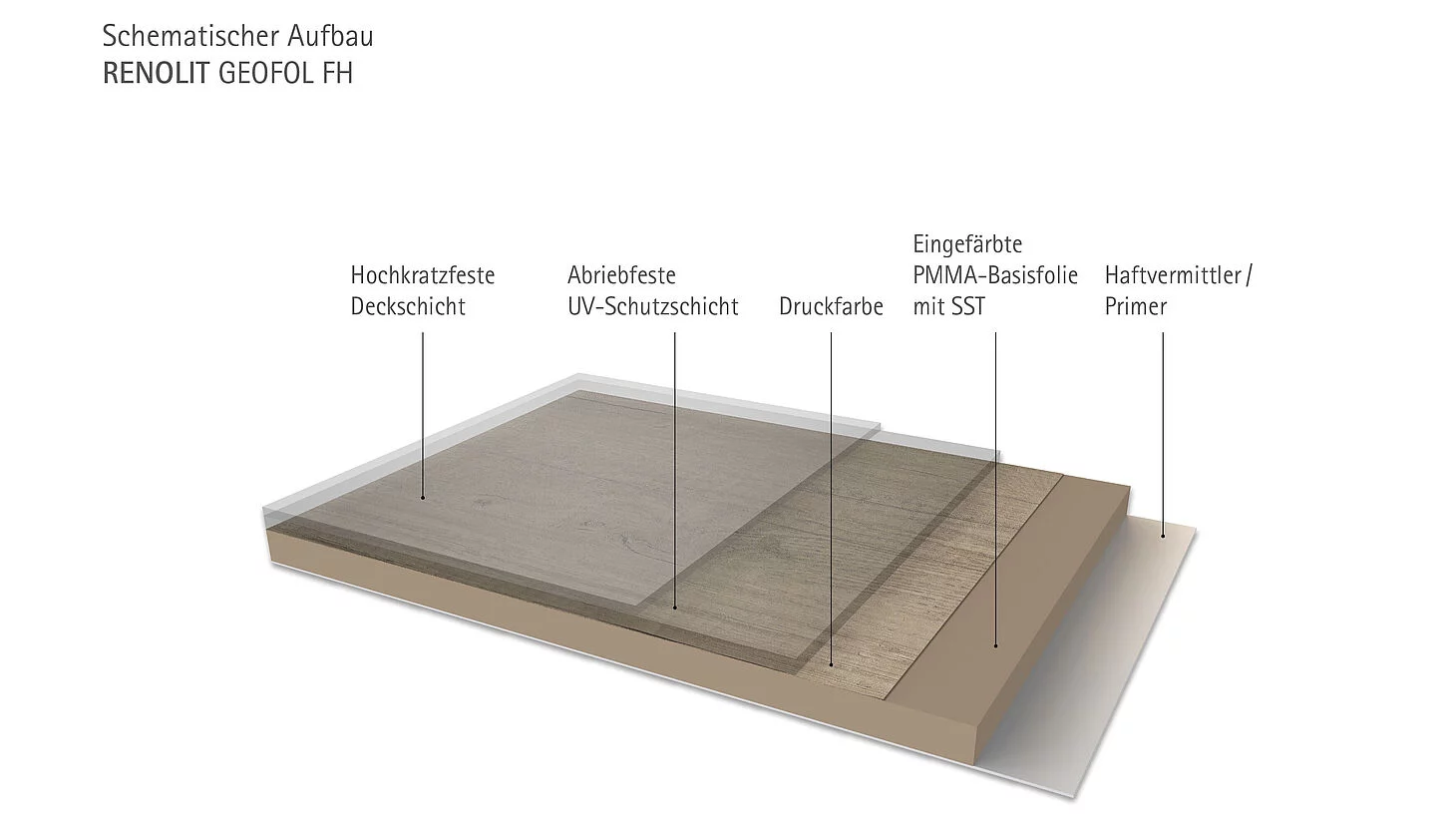 La couche de base de RENOLIT GEOFOL FH est une feuille de PMMA de couleur unie, qui - comme tous les films extérieurs de la société - est renforcée avec la technologie Solar Shield (SST). Les pigments de couleur réfléchissants IR protègent les profils et la feuille elle-même contre un chauffage excessif. Sur les marchés d’Europe occidentale, RENOLIT offre une garantie de dix ans, y compris la solidité des couleurs - une première dans le domaine des terrasses industrielles.