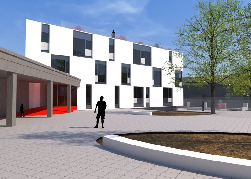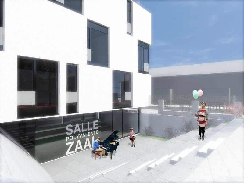Comme l’infrastructure existante n’est pas appropriée à l’organisation de classes maternelles, il a été décidé de construire un bâtiment neuf à cet effet. A l’arrière de la cour se tiendra donc une nouvelle école passive comprenant 8 classes maternelles et une salle polyvalente. Une toiture verte intensive renforce la biodiversité du site.