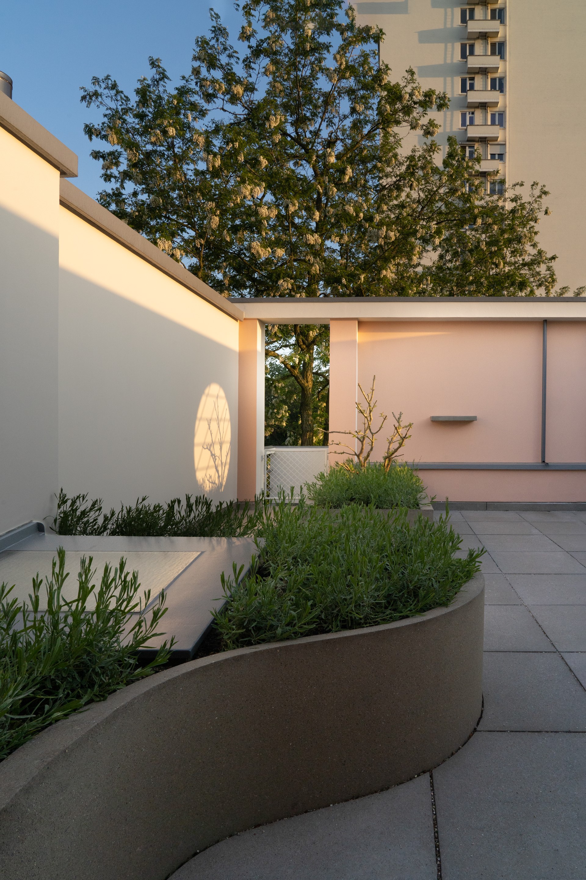 Au-delà du choix judicieux des systèmes et produits, le soin méticuleux apporté aux détails des fenêtres, portes, terrasses et toitures a été déterminant dans la lutte contre les infiltrations d'eau. Cette précision a assuré une durabilité remarquable du projet. Forota, expert en façade Sto, s'est notamment heurté à un défi de taille : assurer une intégration parfaite de l'isolation de la façade avec les nouveaux éléments en béton du toit. Le succès repose sur un élément clé : l'adoption de la plaque StoReno Plan. Il s'agit d'une plaque de support d’enduit de 8 mm d'épaisseur, fabriquée à partir de matières premières minérales, conçue spécifiquement pour rénover les anciens systèmes d'isolation extérieure abîmés. Cette plaque a été intégrée à l'isolation de la façade, établissant ainsi une jonction étanche entre le toit et l'isolation. Cette mesure est cruciale pour garantir l'efficacité et la longévité de l'ensemble du système.