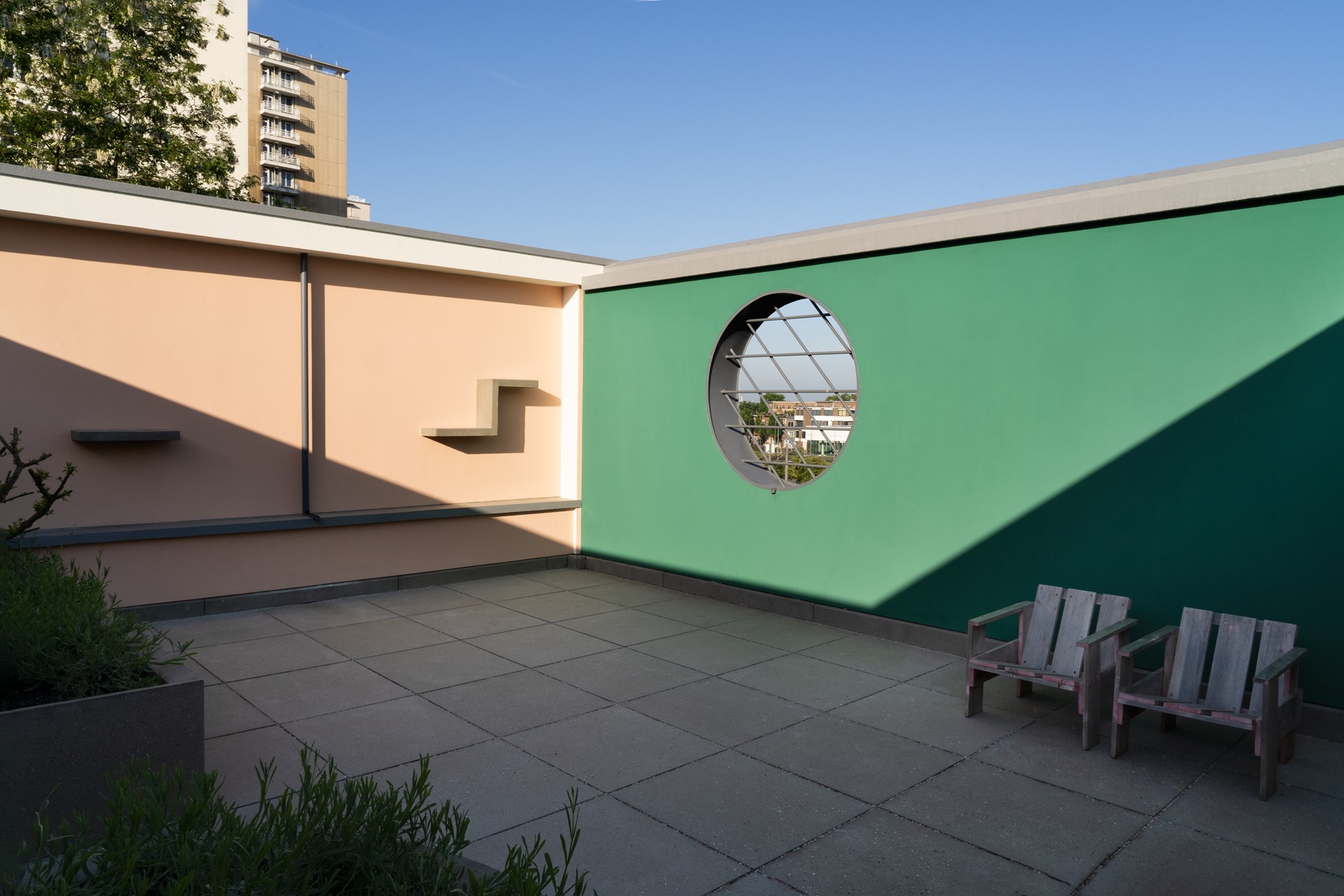 La façade arbore un blanc crème, conforme à la palette de couleurs de Le Corbusier.