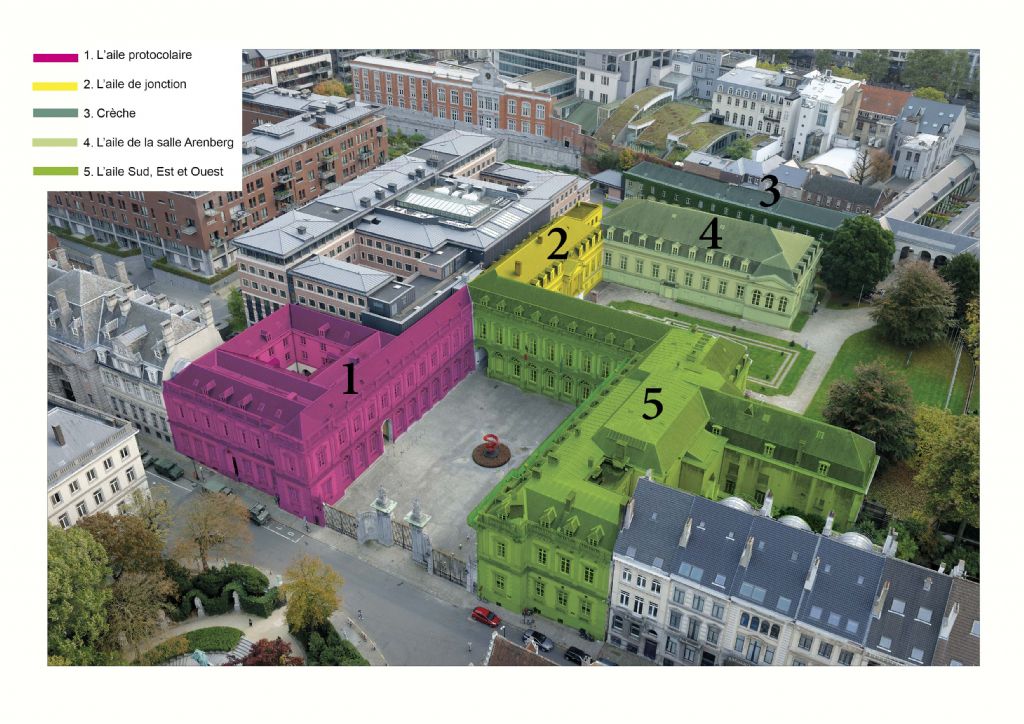 La rénovation des toitures du Palais d’Egmont se déroulera en plusieurs phases afin que le complexe reste toujours opérationnel. Dans la deuxième phase, consécutive à la rénovation des toitures de l’aile protocolaire, la toiture de l’aile de la salle Arenberg sera rénovée. La troisième phase concernera la rénovation des toitures des ailes Sud, Est et Ouest.