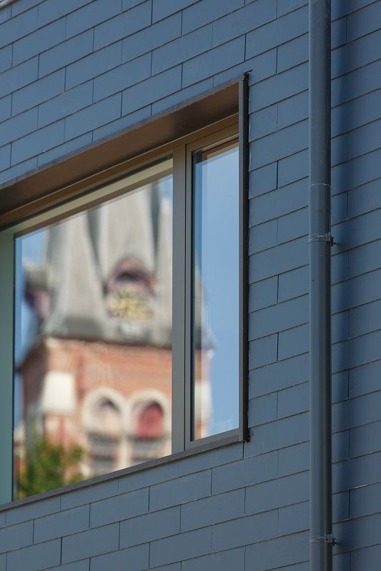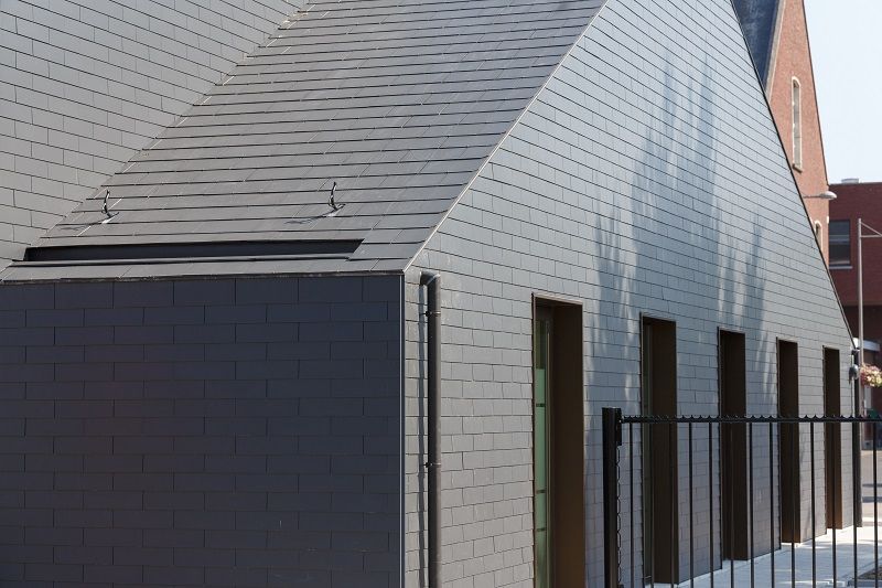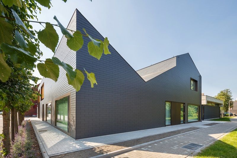 Avec son enveloppe uniforme d’ardoises en fibres-ciment, le nouveau centre social se démarque nettement de son environnement architectural, caractérisé surtout par une grande diversité de coloris et de matériaux. Les façades et toitures sont toutes revêtues d’ardoises de ton foncé et le jeu savant des toits inclinés répercute le style architectural avoisinant, tout en y ajoutant une subtile touche d’originalité par l’intermédiaire de la toiture de l’extension, inclinée à contresens. La compacité de la construction limite les pertes caloriques au strict minimum et les façades-rideau bardées d’ardoises en fibres-ciment ont permis d’appliquer sur tout le pourtour du bâtiment une couche d’isolation suffisante.