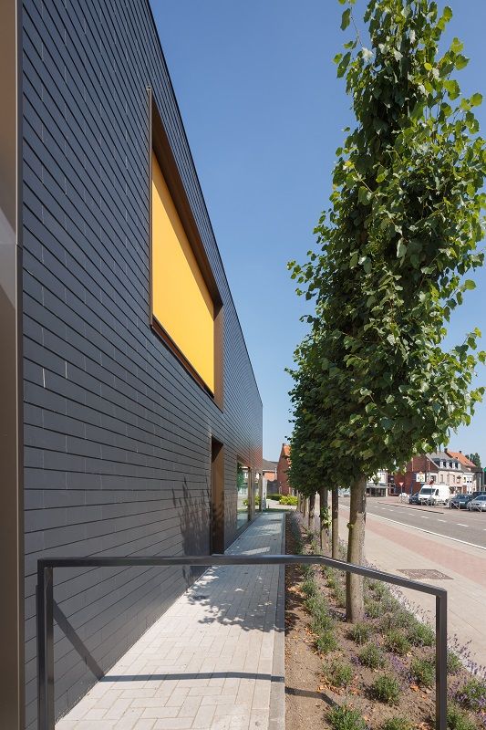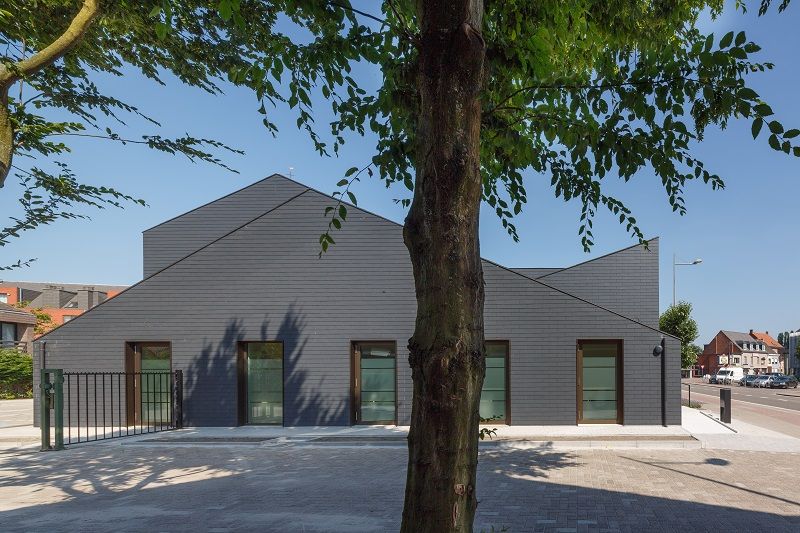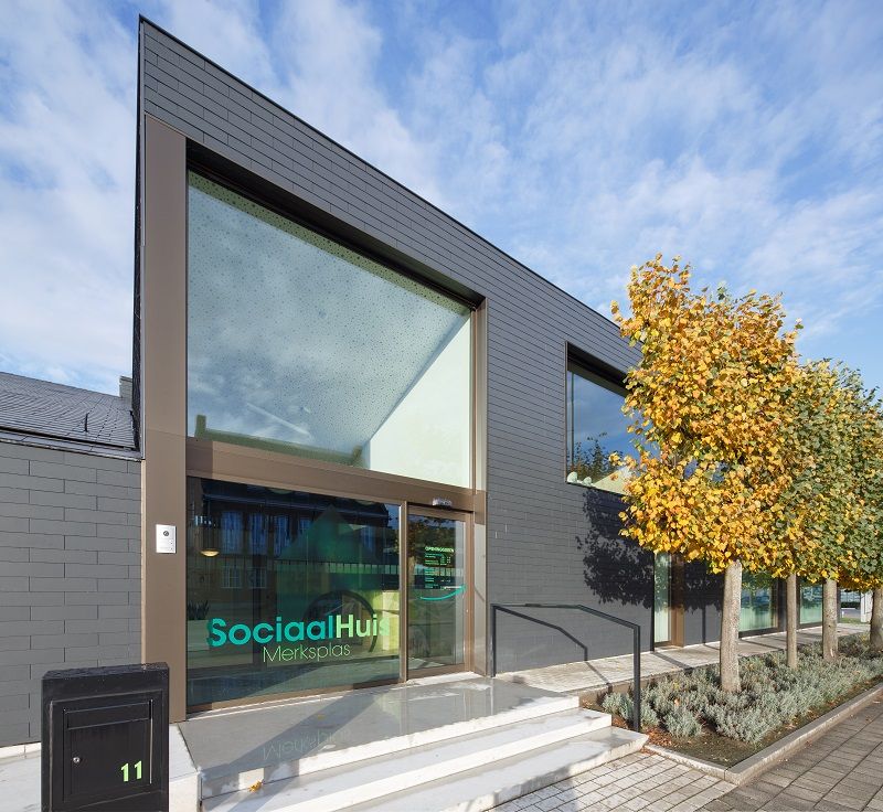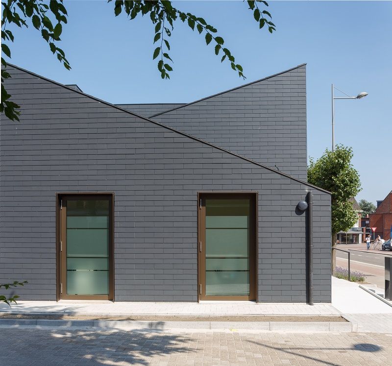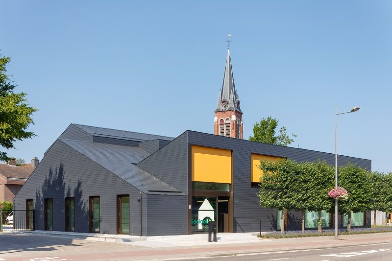 L’ancienne caserne de gendarmerie dans le centre de Merksplas a été reconvertie en un centre social communautaire. D'une superficie de 615 m2, le projet a comme structure porteuse la maçonnerie existante (partie extension) et une ossature en bois (partie rénovation). Tant la façade que le toit sont recouverts d'ardoises Alterna gris foncé d'Eternit. La rénovation a été menée par le bureau RADAR Architecten, basé à Anvers, avec l'assistance technique de Bureau Bouwtechniek.