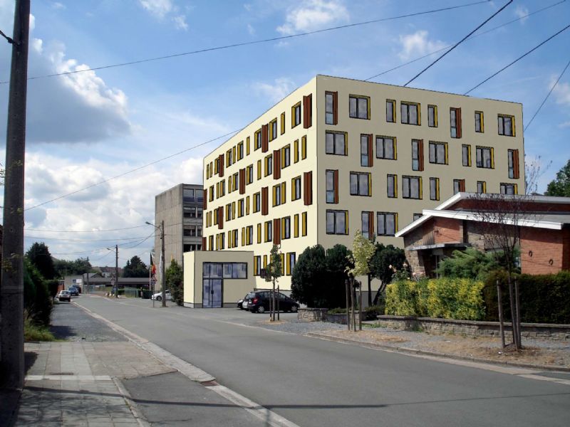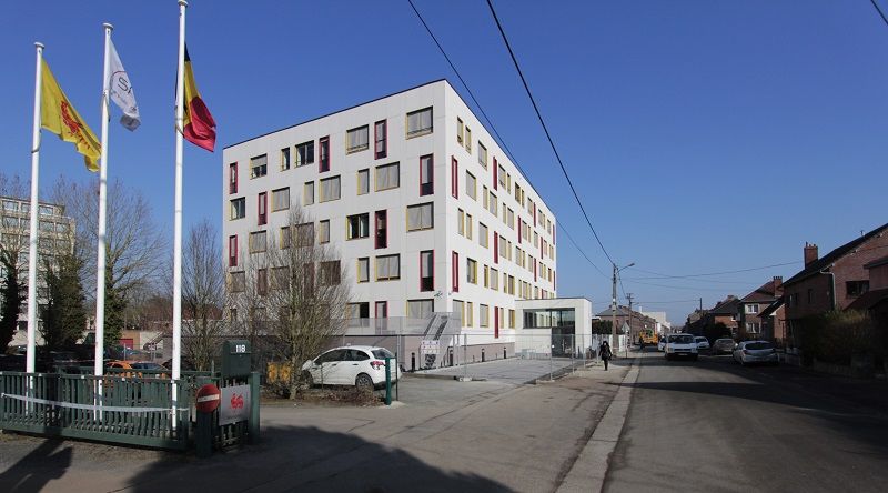 Pour rompre avec l’extrême régularité de l’ancienne façade architectonique, les architectes ont introduit une rythmique des fenêtres aléatoire, tout en conservant la modularité existante des espaces intérieurs. Cette rythmique est renforcée grâce au rappel de la présence des cadres débordants des châssis et l’utilisation de couleurs qui contrastent avec une façade sobre mais néanmoins élégante. Les teintes utilisées ont été choisies en concertation avec l’urbanisme de Mons et le maître d’ouvrage.
