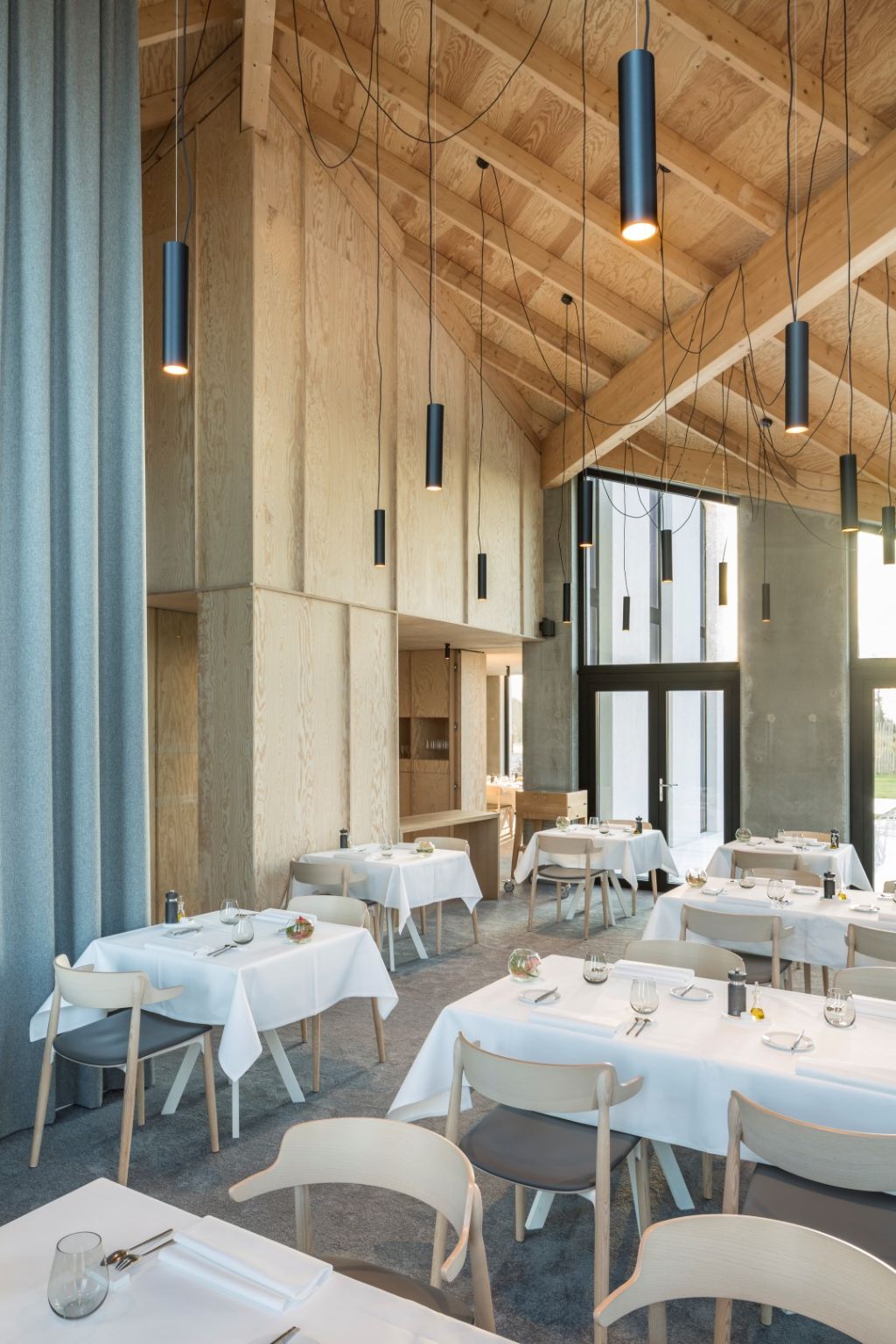 Convaincus de l’importance de la spatialité dans l’expérience culinaire d’un restaurant gastronomique, les architectes ont laissé apparents les matériaux afin que leur brutalité naturelle exprime une certaine préciosité et noblesse. Ils ont également travaillé subtilement le calepinage. Avec les parois en béton, la charpente en bois et le sol recouvert de tapis, chaque matériau est à sa place et s’articule aux autres pour générer une ambiance chaleureuse. La réverbération acoustique des éléments porteurs est palliée par leur volumétrie et l’absorption des drapés séparant les espaces.