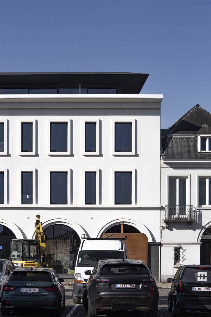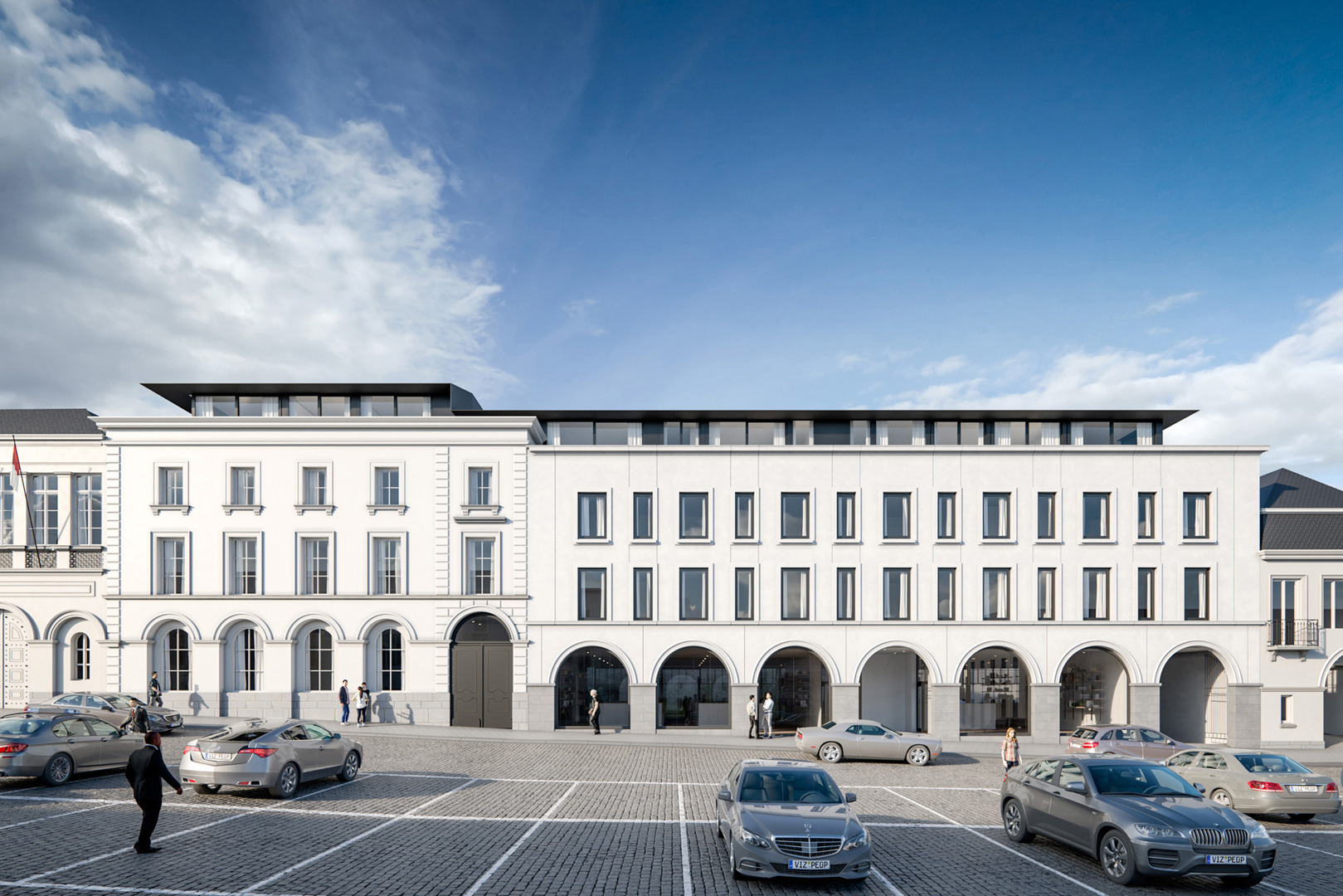 Le programme comprenait, d’une part, la démolition des bâtiments existants à l’exception d’une façade classée, et, d’autre part, la reconstruction de deux bâtiments comprenant trois unités commerciales et onze appartements de luxe. Compte tenu des éléments néoclassiques typiques, comme les fenêtres à moulures, les bandeaux continus, les couleurs, etc., le projet s’est naturellement orienté vers une façade de style néoclassique, interrompue par sept arcs au rez-de-chaussée et une rangée de treize ouvertures rectangulaires verticales aux deux étages supérieurs. L’aspect épuré est renforcé par une corniche en encorbellement qui marque le sommet de la façade. L’ensemble dégage un caractère théâtral qui sied mieux à la place publique et aux bâtiments environnants qu’à la fonction effective du bâtiment