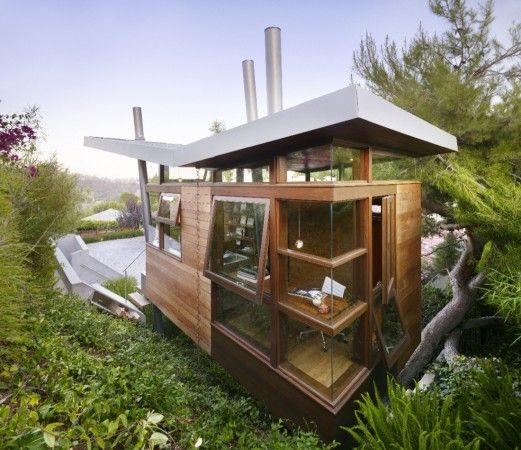 La cabane Banyan de RPA est reconnaissable à sa toiture papillon. Il s'agit d'un studio d'artiste. Soutenu par des pieux en béton, la maison surélevée s'organise autour du tronc d'un arbre important du site. Le projet est entièrement construit et fini en bois, ce qui lui donne un aspect chaleureux et acceuillant.