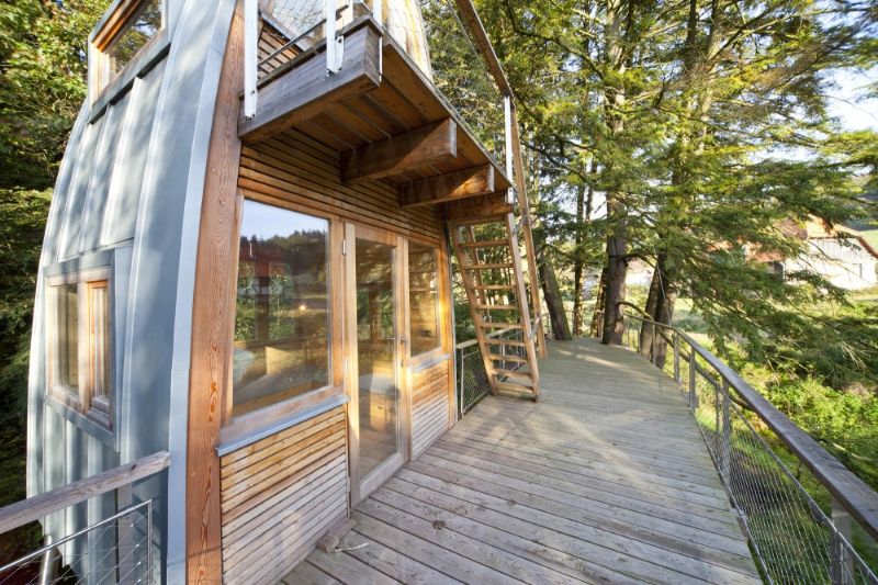 Cette cabane perchée au bord d'une falaise est un autre projet de baumraum. Le concept est en fait une extension d'une résidence existante. La cabane est accessible via une fine passerelle, suspendue à un chêne. La maisonnette elle-même est soutenue par deux poteaux et offre une vue magnifique sur la campagne environnante.