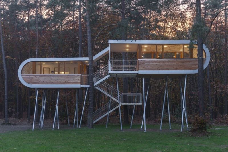 Encore un projet de baumraum. La commande est venue de Sappi, l'agence flamande de la forêt et de la nature. L'objectif était de promouvoir un style de vie plus durable. Le projet se divise en deux niveaux et comprend des salles de conférence, un espace de vie, une cuisine et un espace pour des événements publics. Le bâtiment est soutenu par 19 poteaux fixés avec des vis écologiques. La cabane dans les arbres est neutre en matière de CO2 et sert d'exemple pour diminuer la consommation énergétique.
