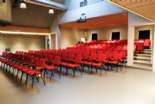La structure caractéristique de l’ancienne école a donc été entièrement maintenue, et la façade avant, à laquelle la population est profondément attachée, inchangée. Seule la travée centrale, dont l’étage était inoccupé jusque-là, a été rehaussée et élargie pour permettre d’insérer les nouvelles fonctions. La hauteur du local existant au rez-de-chaussée a été diminuée pour optimaliser l’occupation de l’étage. L’étude acoustique de l’ensemble des grandes pièces, cruciale notamment pour la nouvelle salle de théâtre (et de projection), comptant tout de même 150 places assises, a été menée par l’Université de Liège. Leur expertise a conduit l’équipe d’architectes à opter pour un important usage du bois et de matériaux bruts (béton, pierres) pour garantir un confort maximal pour les usagers.