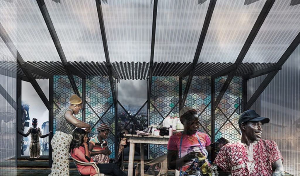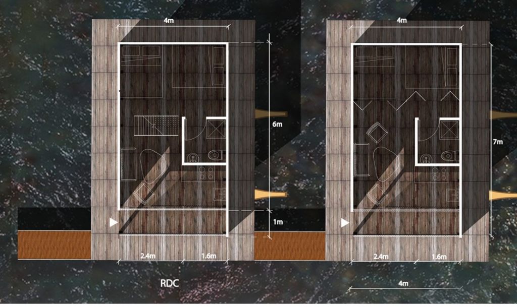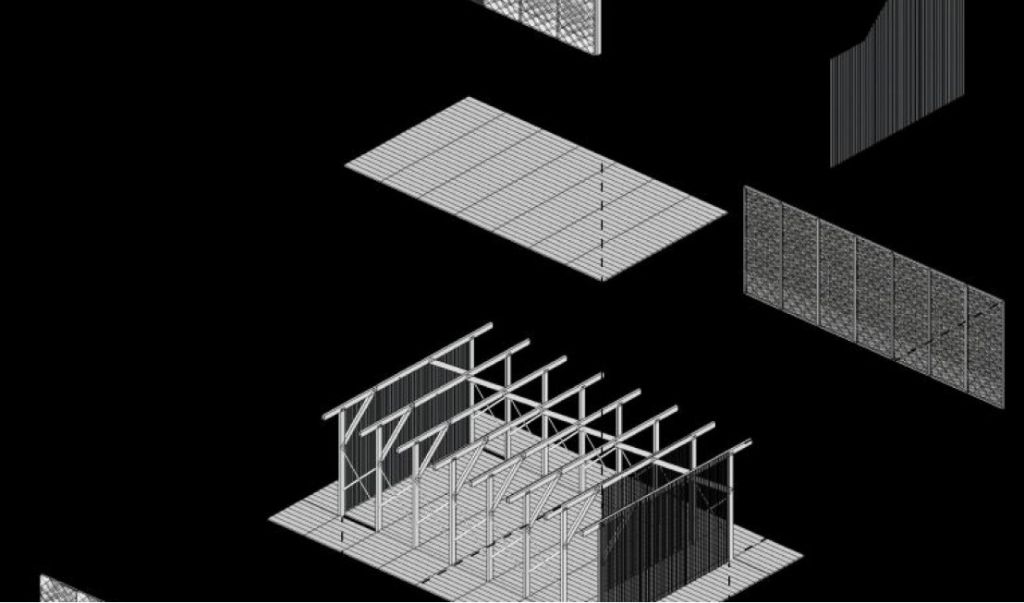 Le couvrement est réalisé avec des cadres acier sur lesquels est soudé un grillage fin. Il sert de support pour venir fixer les écailles de couvrement réalisées sur site grâce aux plaques métalliques trouvées à proximité. Il s’agit une nouvelle fois de pouvoir valoriser la filière locale. Les modules s’agenceront entre eux et seront fixés les uns aux autres afin qu’ils puissent se stabiliser. Ces différents modules créeront une digue de protection en bordure du bidonville afin de briser les vagues. Ils peuvent accueillir du logement, mais aussi d’autres types de programmes tels des commerces, des services…