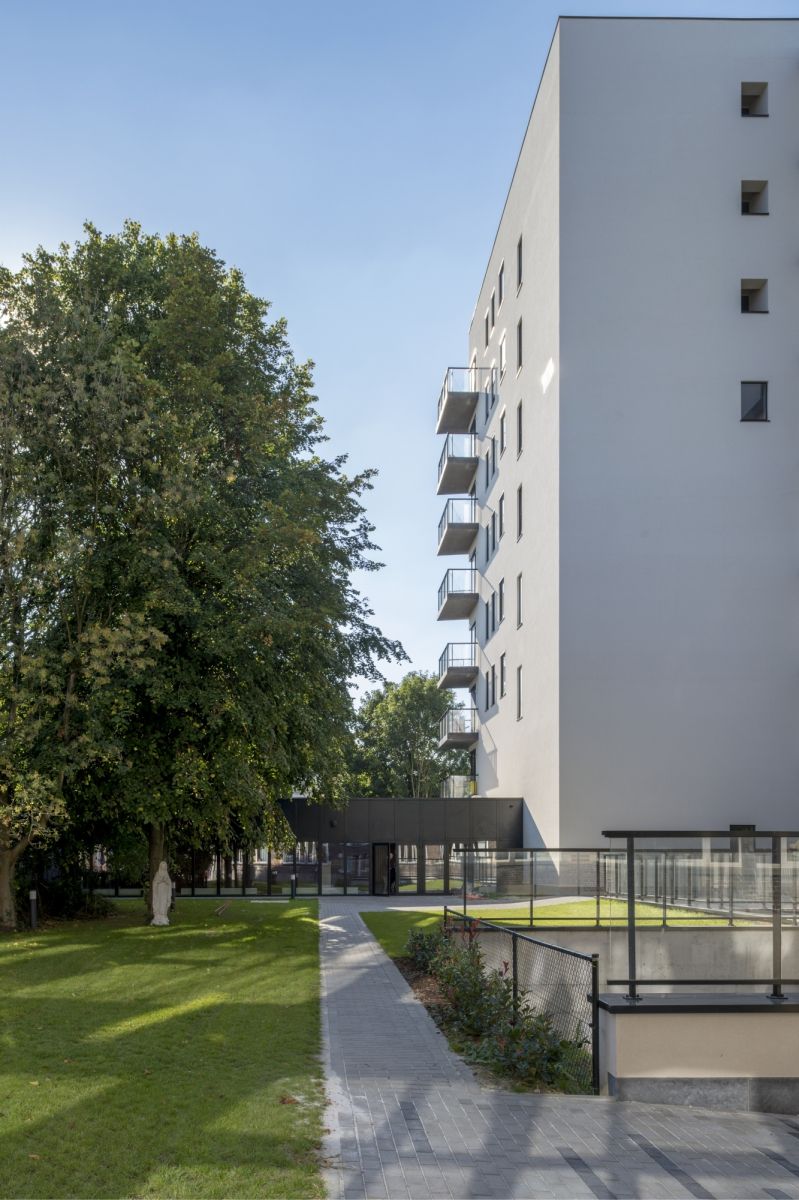 La circulation entre les fonctions de soins et les formes d’habitat autonome est séparée au maximum : l’entrée principale pour la nouvelle unité de soins reste établie au 89, rue de la Marne. Le portail de la rue de Picardie (rue Stroobandt) reste réservé aux livraisons et fonctionne aussi comme entrée principale pour les habitations assistées et le centre local de services. L’accès au garage souterrain s’ouvre dans la rue de Picardie.