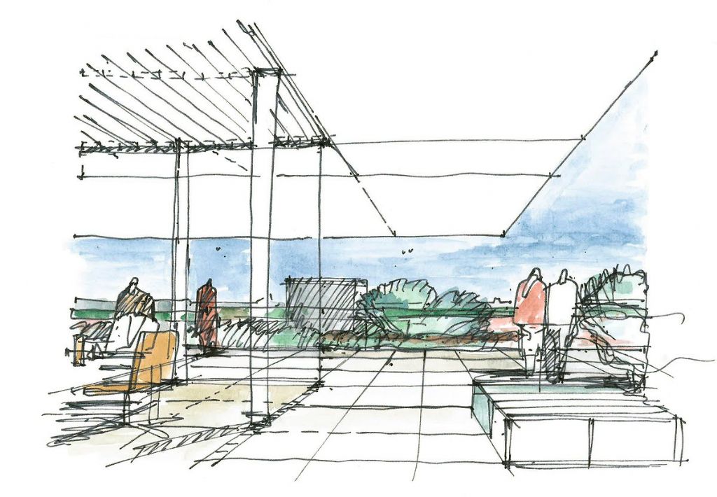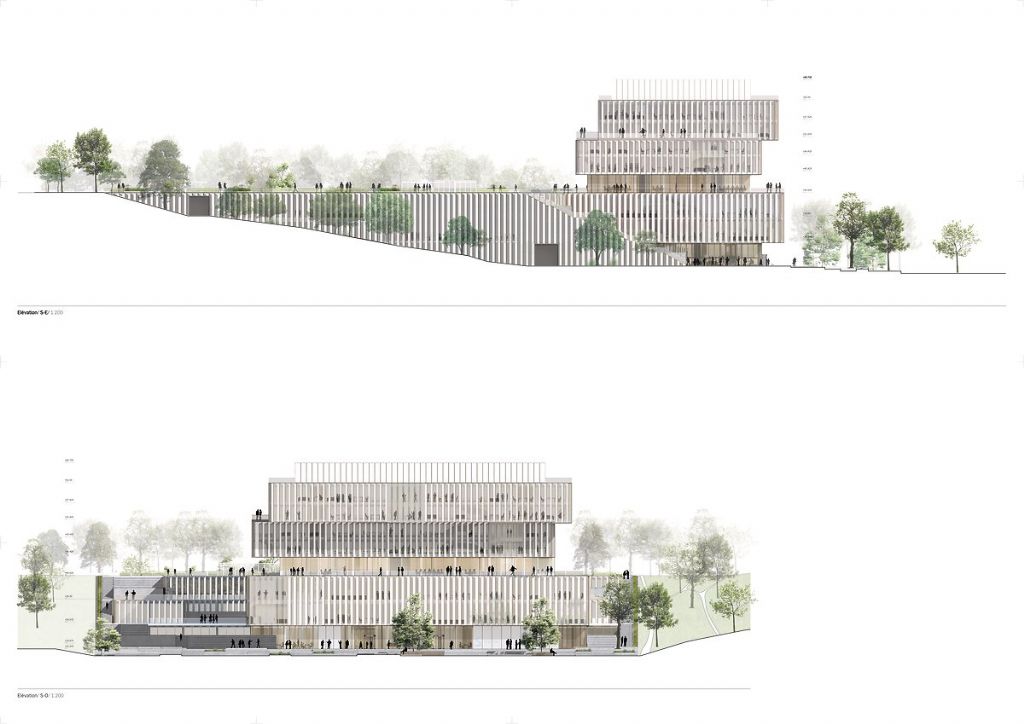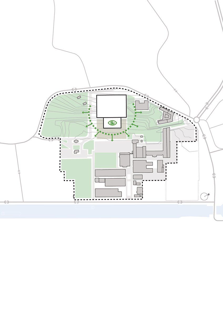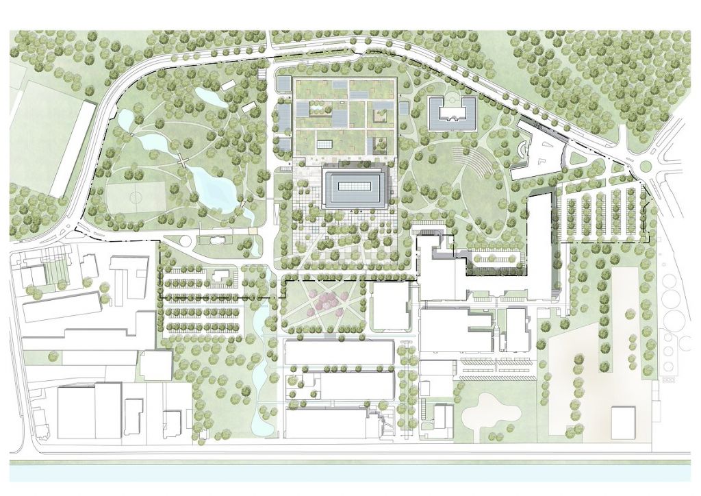La future grande toiture verte, conçue comme un jardin géométrique, offrira une vue dégagée sur les alentours. Elle comprendra aussi des verrières et des grands jardins aménagés qui fourniront un accès à la nature aux ateliers situés en dessous. L’esplanade, un « tapis urbain » qui accueillera les personnes dans les lieux, aura un caractère plus formel et plus urbain que les alentours. On y trouvera jardinières, bancs, arbres et des petits bassins. Le bâtiment donnera une impression dynamique grâce au décalage entre les niveaux et les terrasses. L’utilisation d’applications numériques contribuera à une utilisation intelligente de l’énergie et la construction ouverte et transparente du bâtiment agira comme un phare sur le campus. A l'intérieur, un atrium impressionnant, baigné de lumière naturelle, offrira une connection conviviale et visuelle entre les étages et les départements.