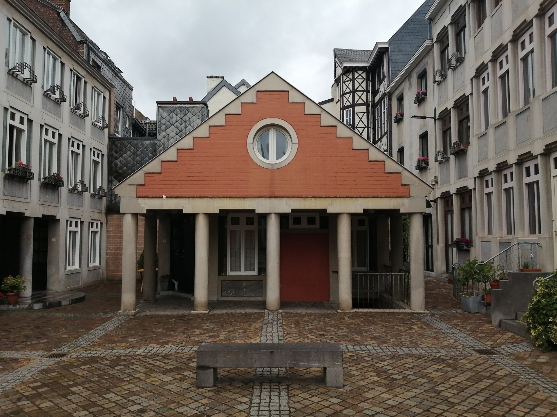 La confrontation numéro deux est la cour Saint-Antoine, où l'architecte Charles Vandenhove et l'ingénieur René Greisch ont restauré et complété des bâtiments des VIIe et XVIIIe siècles entre 1978 et 1985. La cour intérieure devient un sanctuaire postmoderne pour les magazines professionnels. Pendant mes années d'université, ce maniérisme coloré et riche en formes était la tendance, succédant à la stricte pureté du modernisme d'après-guerre d'un Botta, d'un Rossi, d'un Kahn, ou chez nous, d'un Braem, d'un Lampens, d'un Van der Laan. J'ai toujours ri et je me suis interrogé avec pitié sur ce postmodernisme, qui pour moi s'écrivait souvent avec le p de pastiche ou de pâtisserie, mais cette place commence avec le p de plaisant. Elle reste une oasis urbaine à l'espièglerie contrôlée, où cinq enfants s'aspergent mutuellement avec des pistolets à eau, sans savoir que deux heures plus tard, une averse diabolique va vider cette enclave.