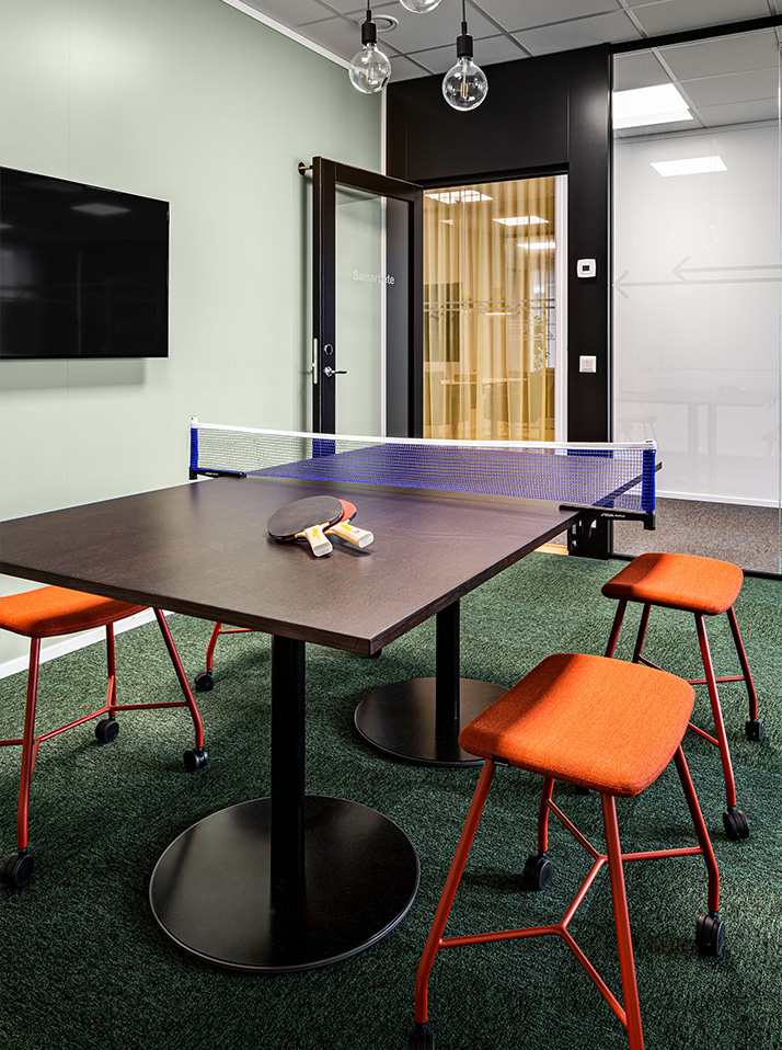 Il en résulte désormais un environnement basé sur l’activité, dans lequel les collaborateurs peuvent choisir leur poste de travail en fonction de leur mission, de leur activité ou de leur humeur actuelle, avec par exemple des zones claires pour une concentration faible, moyenne ou élevée. Il y a aussi des espaces plus ludiques et agréables, comme une salle de midi avec une ambiance agréable de café, une salle d’accueil qui accueille les collaborateurs et les clients, et un espace de ping-pong pour ceux qui ont besoin de faire autre chose pendant un certain temps.