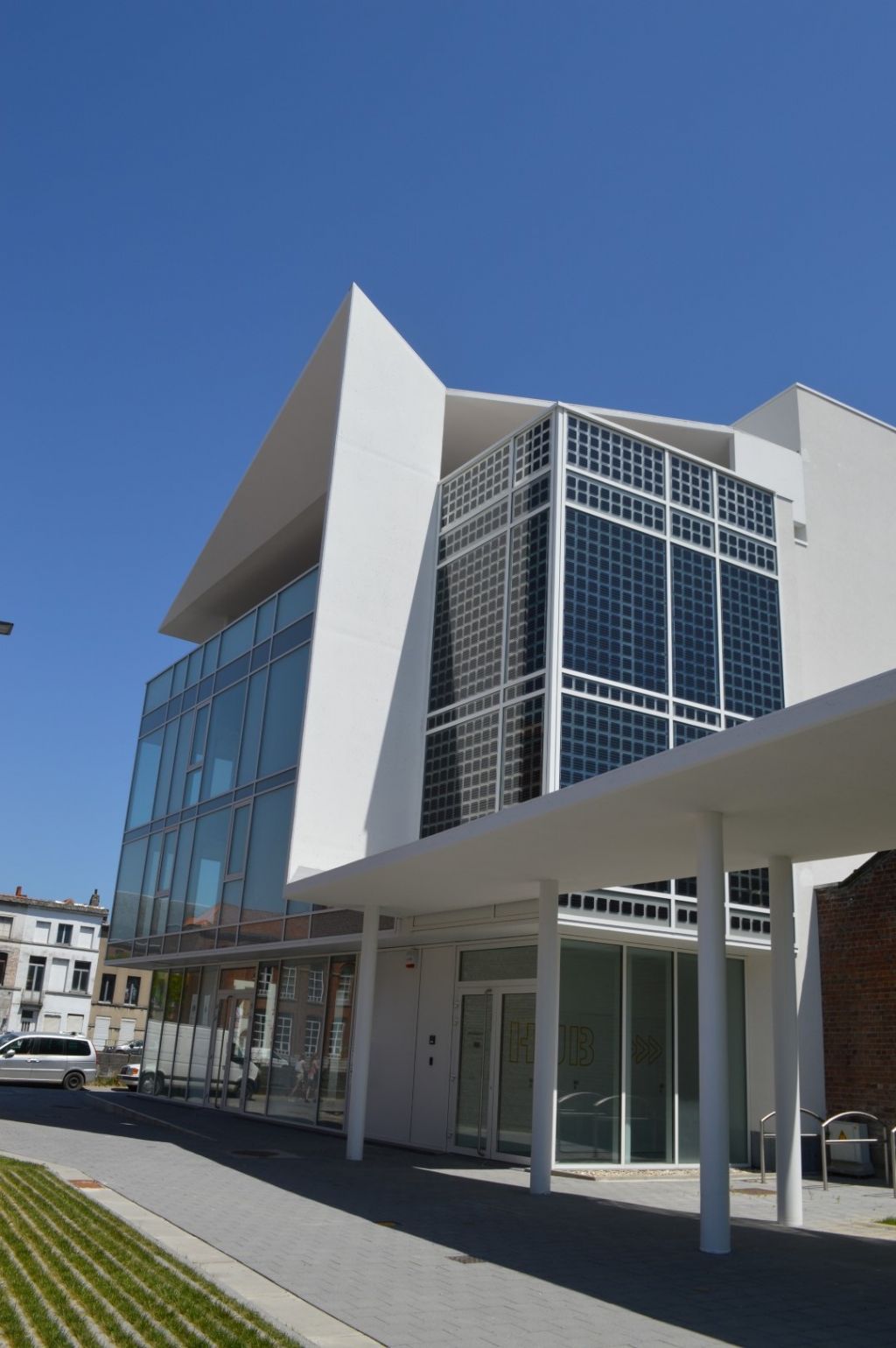 Bertrand Feys : « Le volume du Centre d’Entreprises a été implanté de manière à offrir à l’espace public la façade vitrée des bureaux des halls relais qui se développe derrière la colonnade se déployant sur l’ensemble de celle-ci. La façade de la rue Cherquefosse reprend le gabarit des habitations de cette rue mais s’en différencie par son parement en pierre bleue écurée, pierre dont une grande partie de la ville de Tournai est historiquement construite. » Les bureaux du Centre d’Entreprises sont aménagés au-dessus des halls relais et se déploient autour d’un patio via une circulation périphérique vitrée.
