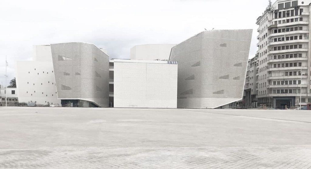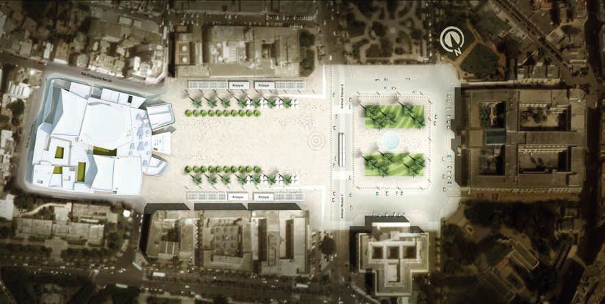 Le projet lauréat se compose de plusieurs pavillons à l’image d’une médina dans la ville. « Au lieu d’un objet architectural autonome, univoque, cet ensemble fluide se joue de la symétrie sans s’y opposer, et invite à pénétrer dans l’ombre d’un autre univers intérieur, en ouvrant plusieurs failles et entrées, fines, attirantes, vers une grande et haute galerie publique traversante formée de piliers incurvés de staff rouge », explique Christian de Portzamparc. « Dans la simplicité extérieure de l’architecture blanche, les failles attirent le passant vers l’ombre, le clair-obscur de ce parcours et de ce lieu d’entrée, passage où l’on vient s’assoir dans les cafés installés ici car l’air y est rafraîchi par la ventilation naturelle. Sur les bâtiments de la place se déploie un voile de moucharabié de terre cuite et résine. »