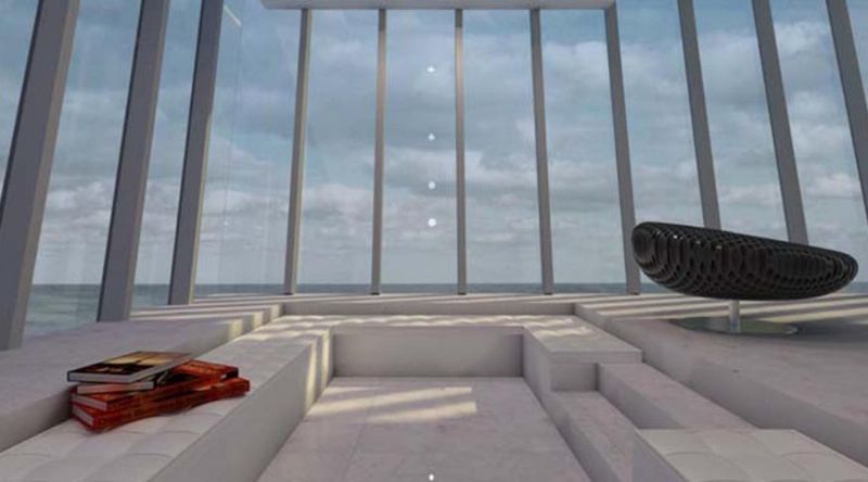 L'habitation, qui compte 4 étages, se trouve sous un garage pour deux voitures situé au niveau de la falaise, ce qui la rend quasi invisible de loin. Comme dans un film de James Bond, on gare la voiture au-dessus de la maison. On pénètre ensuite dans l'habitation en empruntant un discret escalier, qui mène à la pièce en contrebas. Une fois à l'intérieur, on découvre les vues panoramiques offertes par les pièces vitrées. Les pièces sont empilées les unes au-dessus des autres pour aller vers les plus privées au fur et à mesure que l'on descend. La cuisine se trouve au-dessus du salon. Sous elle, on trouve les chambres, qui dominent à leur tour une terrasse privative. Même si elle est compacte, la maison comprend une cuisine complète, une salle à manger, trois chambres, deux salles de bains et un spa en plein air sur la terrasse.