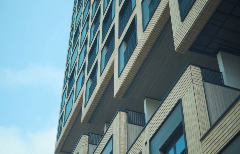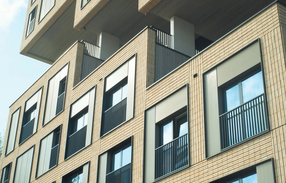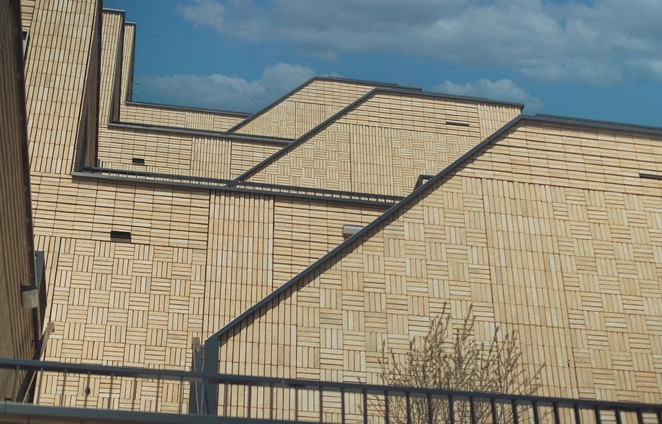 Nous avons opté pour les plaquettes de parement multicolores Freya de Vandersanden. Nous les avons sélectionnées en raison de leur couleur jaune pâle nuancée d’ocre et de gris, et de leur texture intéressante. Grâce à son style distinctif, cette brique de parement était la solution idéale pour donner forme à notre projet. Les briques de la façade de The Cube ont deux profondeurs différentes, ce qui accentue encore le jeu de lignes horizontales et verticales et fait de l’immeuble un élément remarquable dans le paysage visuel.