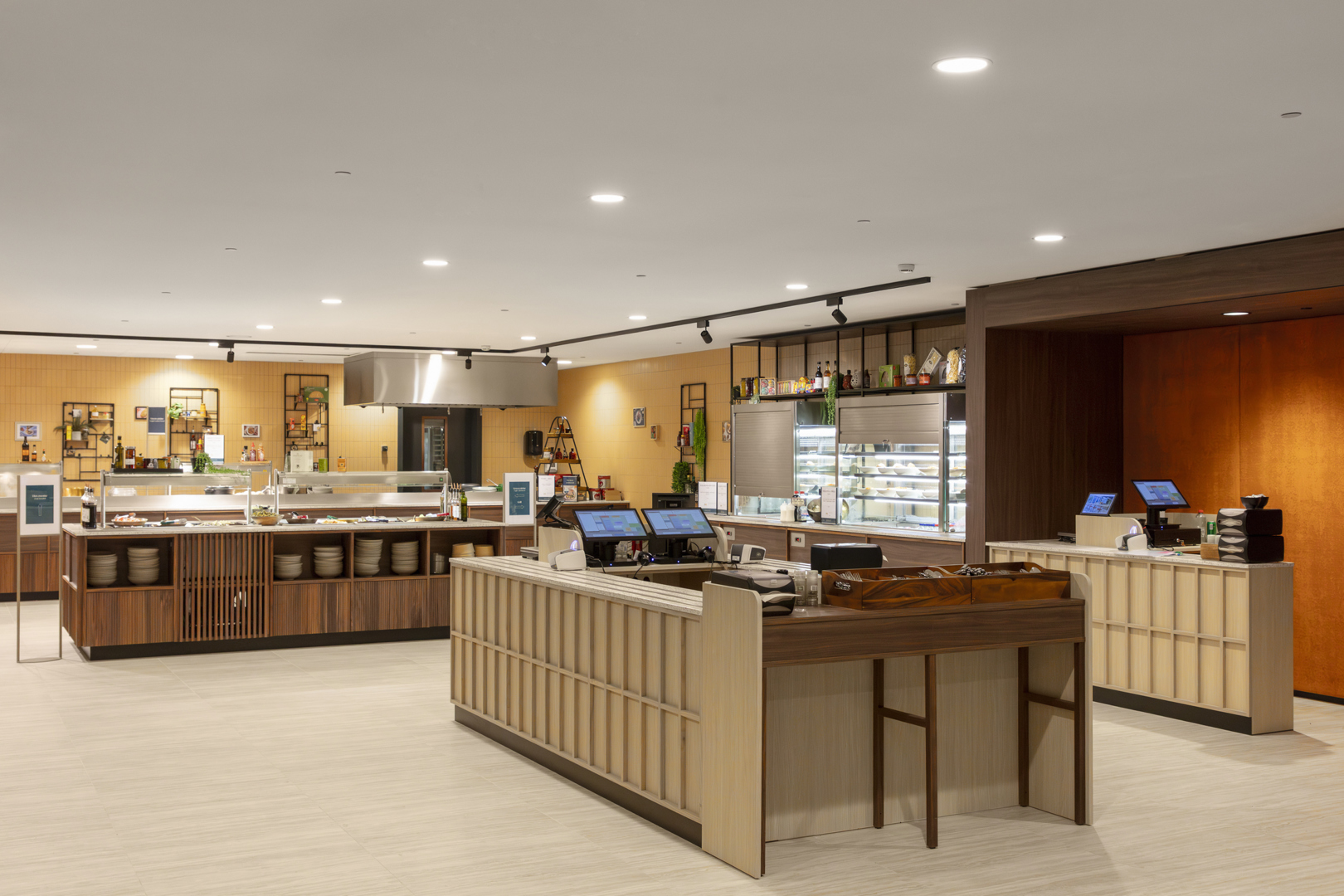 Les dalles Rockfon Mono Acoustic ont été installées dans la majeure partie du bâtiment, à l’exception des couloirs et des locaux techniques. Ici, le choix s’est porté sur le système modulaire Rockfon® Bandraster Dznl avec des profilés dissimulés. Fabrice Alen explique : « Les couloirs comportent de nombreux équipements techniques, de ventilation et d’entretien, ce qui rendait un plafond monolithique moins pratique pour les contrôles et l’entretien. »