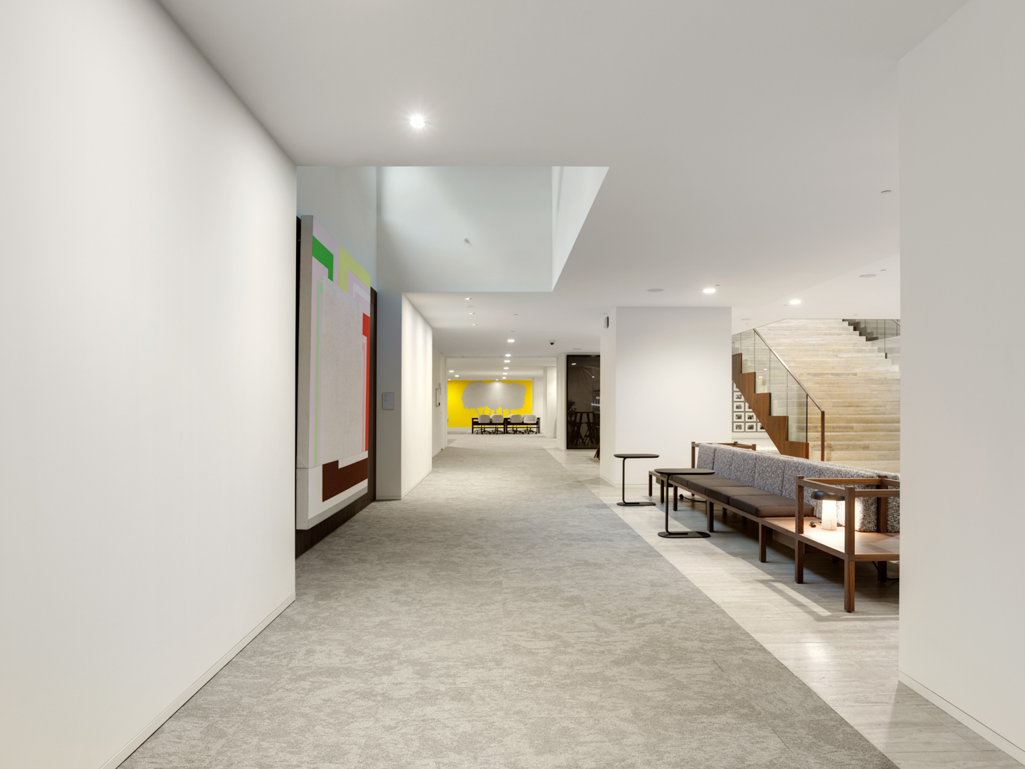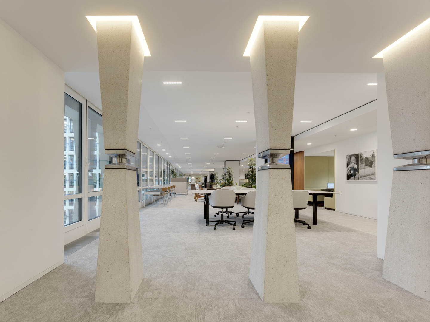 Les espaces de travail ouverts, les zones collaboratives et les salles de réunion se succèdent naturellement, sans créer de perturbations visuelles. C’est pourquoi le choix s’est porté sur un plafond monolithique. L’architecte principal Sebastian Moreno-Vacca précise : « Nous avons découvert des panneaux acoustiques dans un musée : un plafond élégant, sans éclairage ni installations techniques visibles. Généralement, de tels plafonds sont surtout utilisés dans des bâtiments emblématiques, des musées ou des hôtels, mais ils trouvent également toute leur pertinence dans les bureaux. »