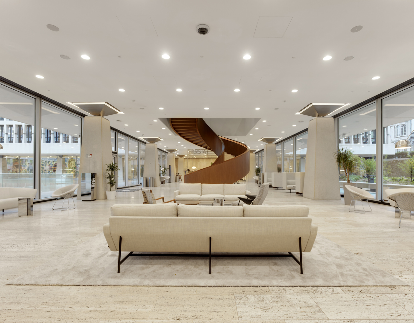Les bureaux d’architecture Moreno Architecture et A2M ont transformé le bâtiment ING Marnix dans le respect de la vision de Gordon Bunshaft. La décoratrice d’intérieur Dorothée Peeters explique : « Nous avons réintroduit ses idées fondamentales en matière de transparence. Celles-ci s’étaient en partie perdues : l’entrée d’origine avait été éclipsée par une entrée secondaire, le rez-de-chaussée s’était densifié au fil du temps et les espaces de travail ne répondaient plus aux attentes actuelles. Bunshaft attachait également beaucoup d’importance à l’art et à l’innovation. Aujourd’hui, l’innovation est aussi synonyme de durabilité : nous avons mis à niveau le bâtiment pour qu’il réponde aux normes des maisons passives, tout en rétablissant la flexibilité, le confort et la cohérence des bureaux. »
