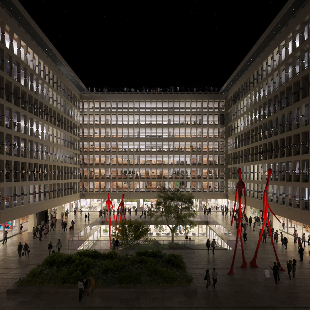 Le cœur architectural de la rénovation est une vaste vacuité verticale reliant l’ensemble des niveaux. Cet atrium apporte la lumière du jour et la ventilation au centre du bâtiment, tout en organisant les circulations et les interactions entre les espaces. L’ancien niveau en sous-sol a été ouvert pour former un duplex public de 6 000 m², consacré à l’art, aux rencontres et aux événements, en lien direct avec le jardin.