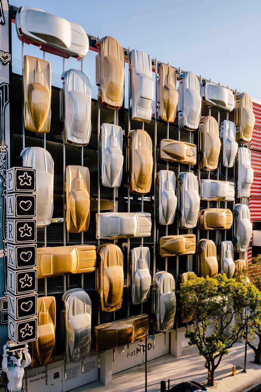 Pour créer l’espace situé entre la façade de Nicolas Buffe et celle de K/R, le bureau espagnol Clavel Arquitectos, s’est inspiré de la vie urbaine dans le Design District. Le bureau a imaginé 'Urban Jam', une façade composée de 45 carrosseries métalliques dorées et argentées, défiant la gravité dans une sorte d'embouteillage vertical surréaliste qui fait penser à un autre jeu de société, Rush Hour.