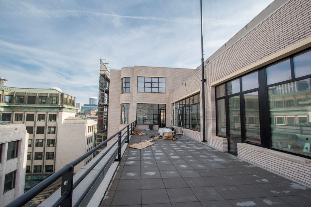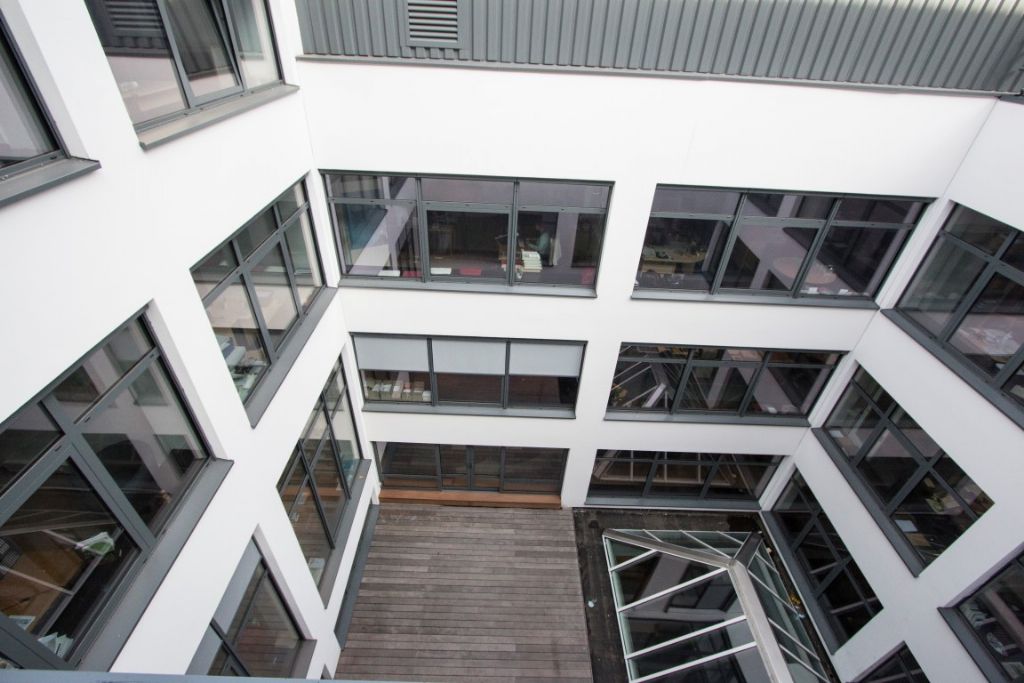 Pour plus de confort et de sécurité, des travaux d’infrastructures ont été menés : remplacement de sanitaires, renouvellement du plancher de 480 m2 de la menuiserie et de la salle de montage, mise en conformité des ascenseurs… Les deux façades aux styles très contrastés ont également été restaurées selon leur particularité architecturale. La façade néoclassique de la rue Léopold a été repeinte, avec des balcons et des portes revalorisés. La façade moderniste de la rue Fossé aux Loups caractérisée par son granit suédois et son ardoise noire a été nettoyée et réparée. Les accès et les portes de garage y ont été renouvelés. Cerise sur le gâteau : une nouvelle enseigne inspirée par le logo des anciens entrepôts a été placée.
