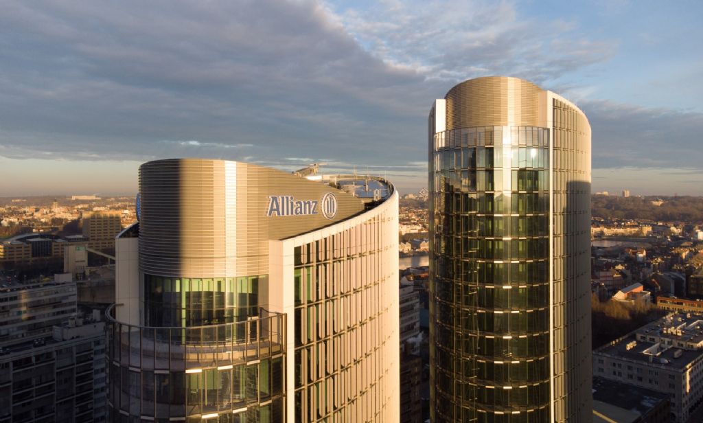 Charlie Malou : « En façade sud, une double peau permet de limiter les apports solaires tout en affinant la volumétrie de la tour. La protection solaire est assurée par la présence de planchers en caillebotis à chaque étage ainsi que par la réflexion sur le vitrage extérieur. Ce vitrage extérieur fait également office de garde-corps pour la terrasse de la salle du Conseil au dernier étage. Des entrées d’air dans la double peau ont été aménagées pour créer un effet de cheminée et extraire la chaleur. » Pour Allianz, l’architecte a de plus opté pour un vitrage brillant et légèrement bleuté, ce qui donne une tour très vivante, réfléchissant les couleurs du ciel au fil de la journée. Depuis l’intérieur, la teinte bleutée du vitrage apporte inconsciemment une impression de beau temps même par ciel gris…