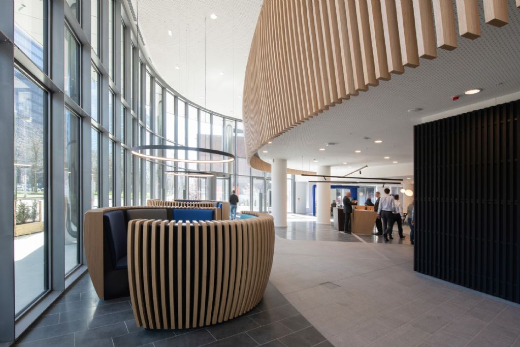 Charlie Malou, architecte associé ayant géré la conception d’exécution et le suivi de chantier : « Le système de plafonds rayonnants est un optimum énergétique et acoustique. Malgré la forme du bâtiment, les îlots sont rectangulaires, sans pertes de matière, et l’espace entre eux permet de bénéficier de l’inertie de la dalle en béton. Ils ne touchent pas la façade et sont laissés sans cache-rail. On voit donc le béton, les gaines, … un côté brut qui a été bien accueilli par Allianz ». Une certaine sobriété dans les finitions qui colle bien à la philosophie BREEAM. Là où certains tentent de faire impression avec un jeu de matériaux fort complexe, ici la forme, la lumière et la vue suffisent, le reste est superflu.