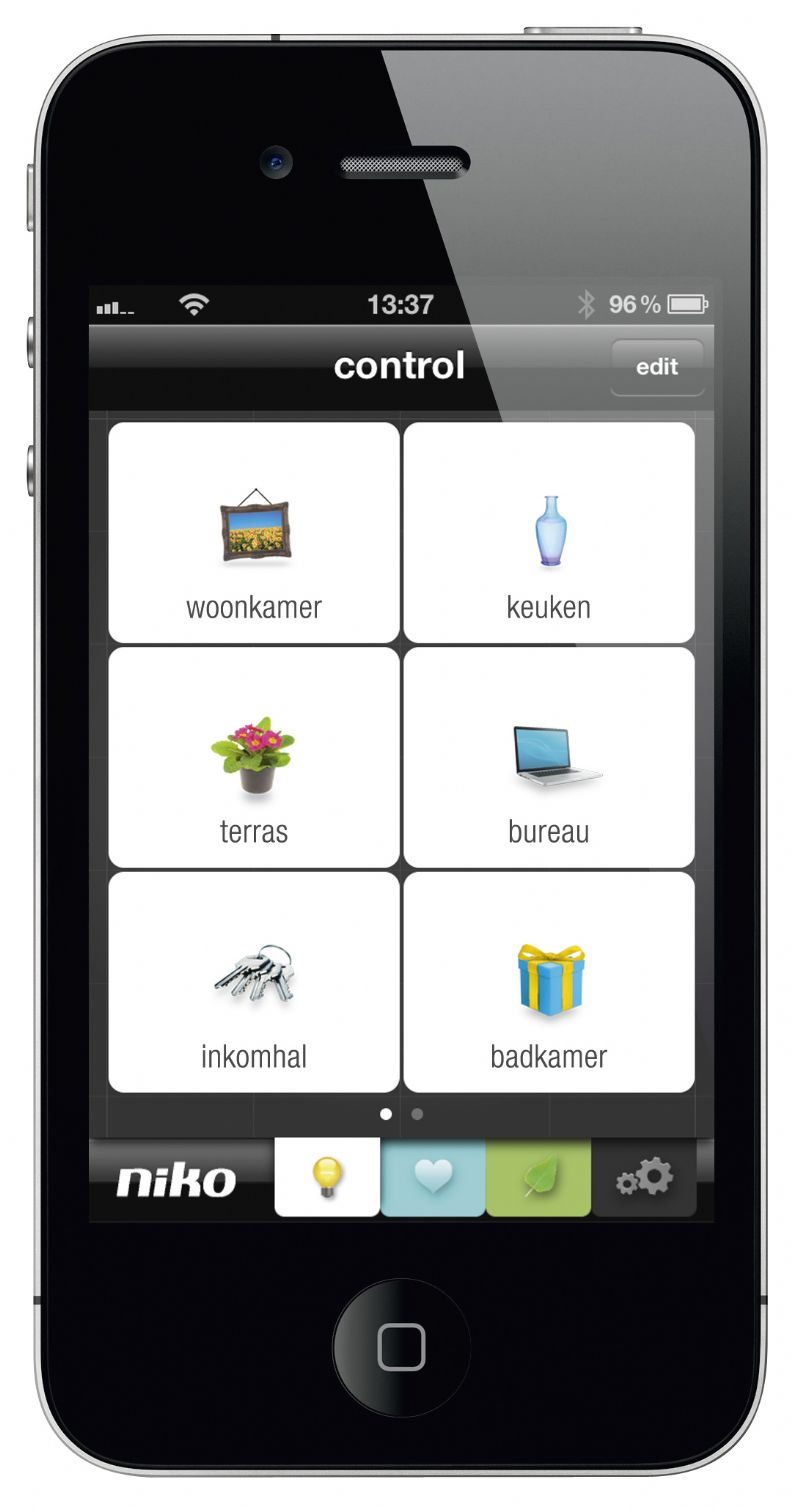 La touche éco permet d’éteindre l'éclairage et les appareils non utilisés. Elle se révèle très utile lorsque l'on doit partir rapidement au travail ou durant la nuit : le chauffage et la ventilation peuvent en effet être diminués, puisque toute la famille est endormie. Niko Home Control peut aussi être contrôlé à distance, grâce à une application sur smartphone ou tablette.