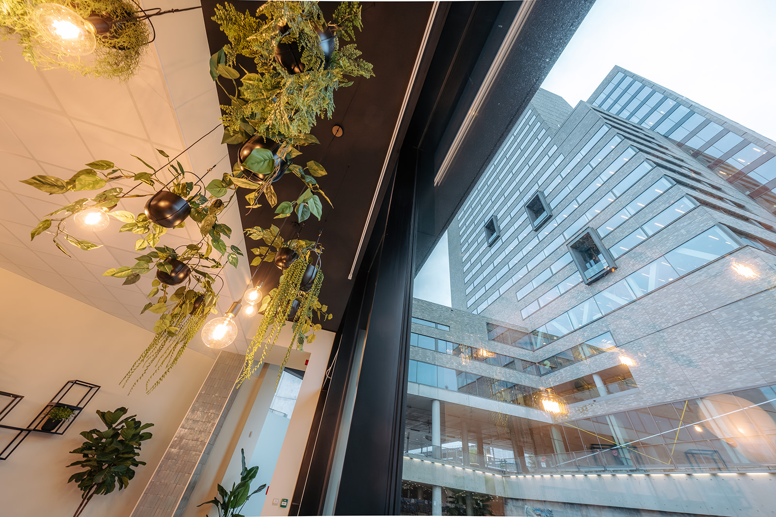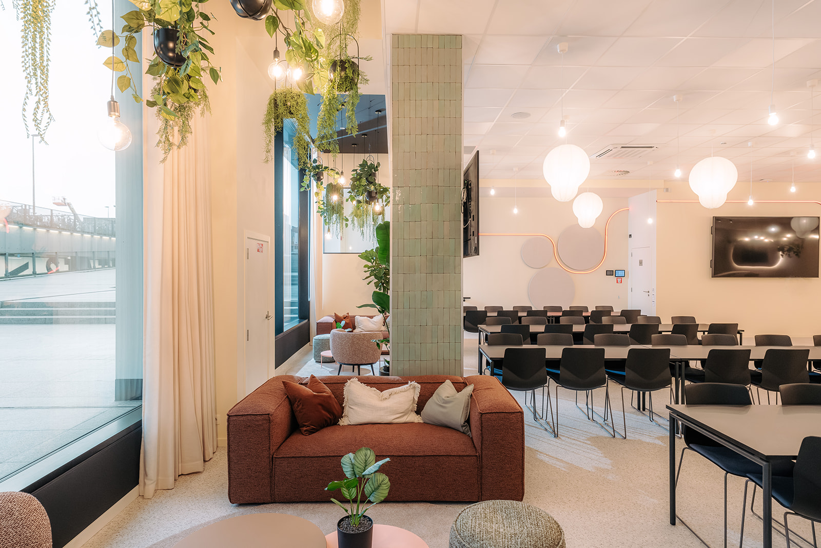 - une zone lounge le long de la façade vitrée : trois coins salon y ont été aménagés, complétés par des rideaux qui apportent davantage d’intimité et par de grandes plantes qui renforcent l’atmosphère chaleureuse. Les larges fenêtres laissent entrer une abondante lumière naturelle et font de cet espace un lieu adapté aussi bien à de brèves réunions qu’à des pauses plus calmes.