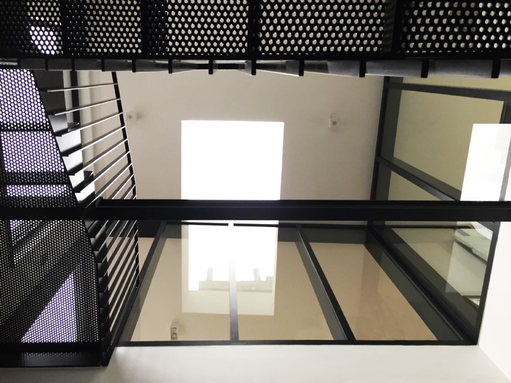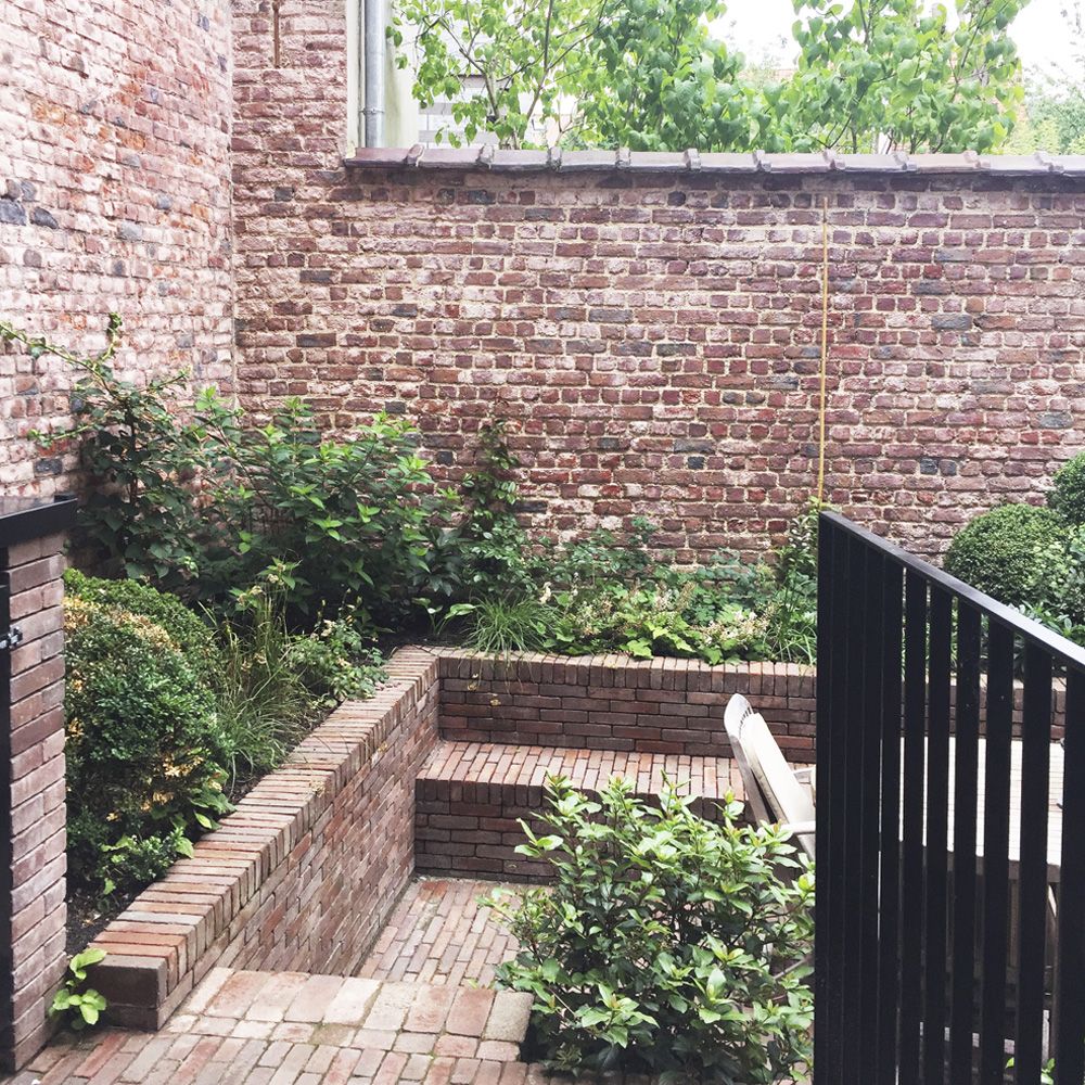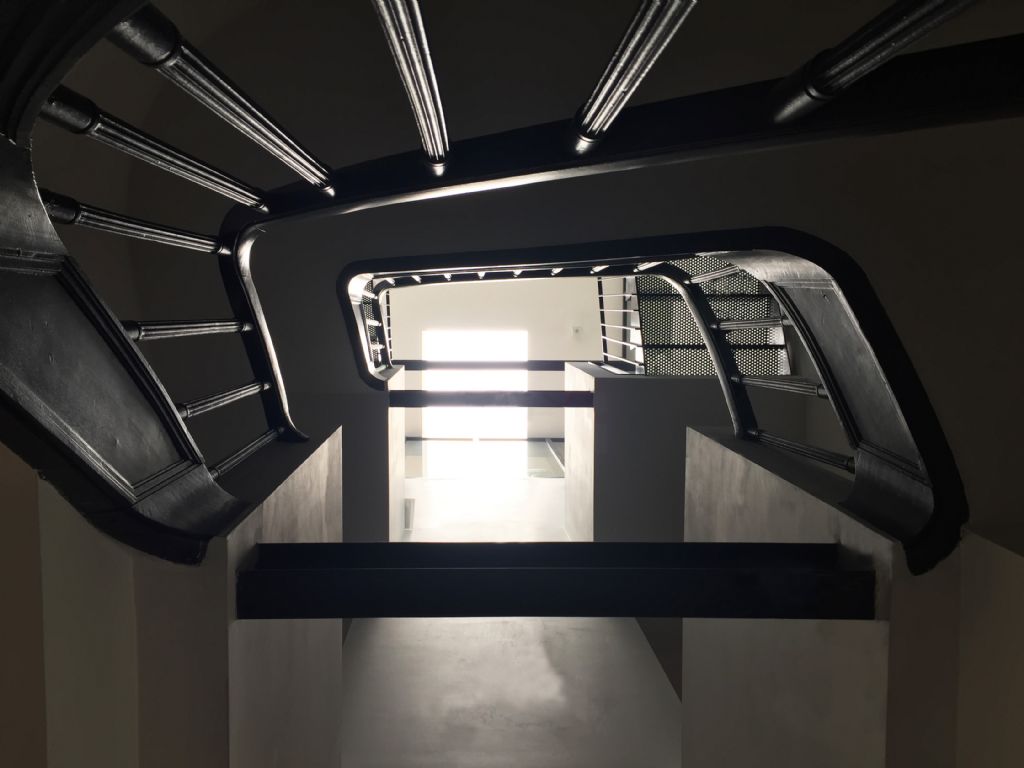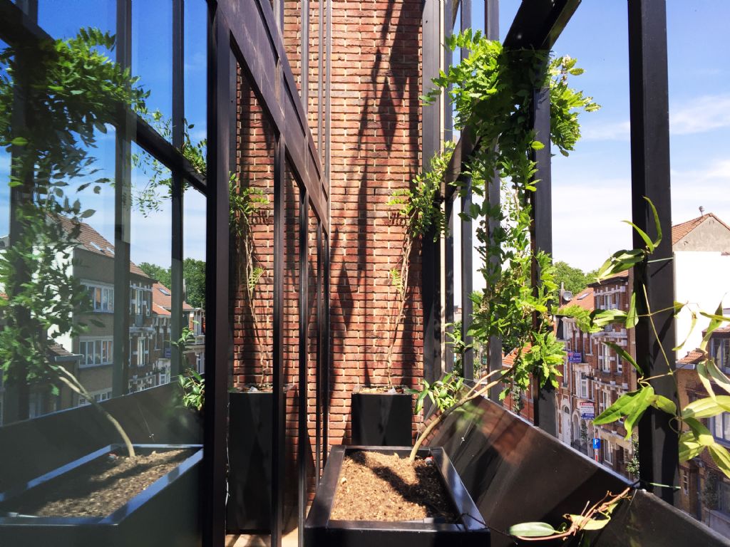 Dans le séjour du rez, une relation privilégiée est établie avec la cour qui est transformée en jardin contre le mur d’enceinte et en une terrasse en creuset pour libérer la vue de tout mobilier extérieur. Le niveau inférieur, depuis la salle de jeux des enfants, profite également de la modification du sol pour bénéficier de lumière et de la vue vers un talus planté. A l’intérieur, les matières et ouvrages d’époque sont conservés et restaurés : l’escalier en bois à double quartier tournant, les planchers en bois, le granito du rez, les maçonneries. Telle de la marqueterie, les nouveaux matériaux sont incrustés dans l’existant. A l’extérieur, le vert dans l’âme, le fer comme trame, les éléments du projet s’articulent autour du vivant (plantations et petite faune associée) et de matériaux traditionnels (verre, acier, brique et enduit). La coupe quant à elle exprime les cadrages et les relations visuelles intérieures et extérieures, les reculs formant les plateformes plantées aux troisième et quatrième étages, les variations des niveaux du jardin en terrasses entre le rez et le premier étage. Certaines baies sont augmentées ou créées pour cadrer des vues et apporter de la lumière. Un nouveau puits de lumière transforme l’escalier et ses paliers en lieu à part entière. Le coeur de l’espace de circulation, sombre à l’origine, est baigné de lumière depuis le troisième étage jusqu’au rez. Autour de cette centralité verticale, des cloisons vitrées offrent une clarté supplémentaire dans le séjour et le vestibule. En ce sens, le projet s’affirme dans une relation intro/extravertie avec l’espace public.