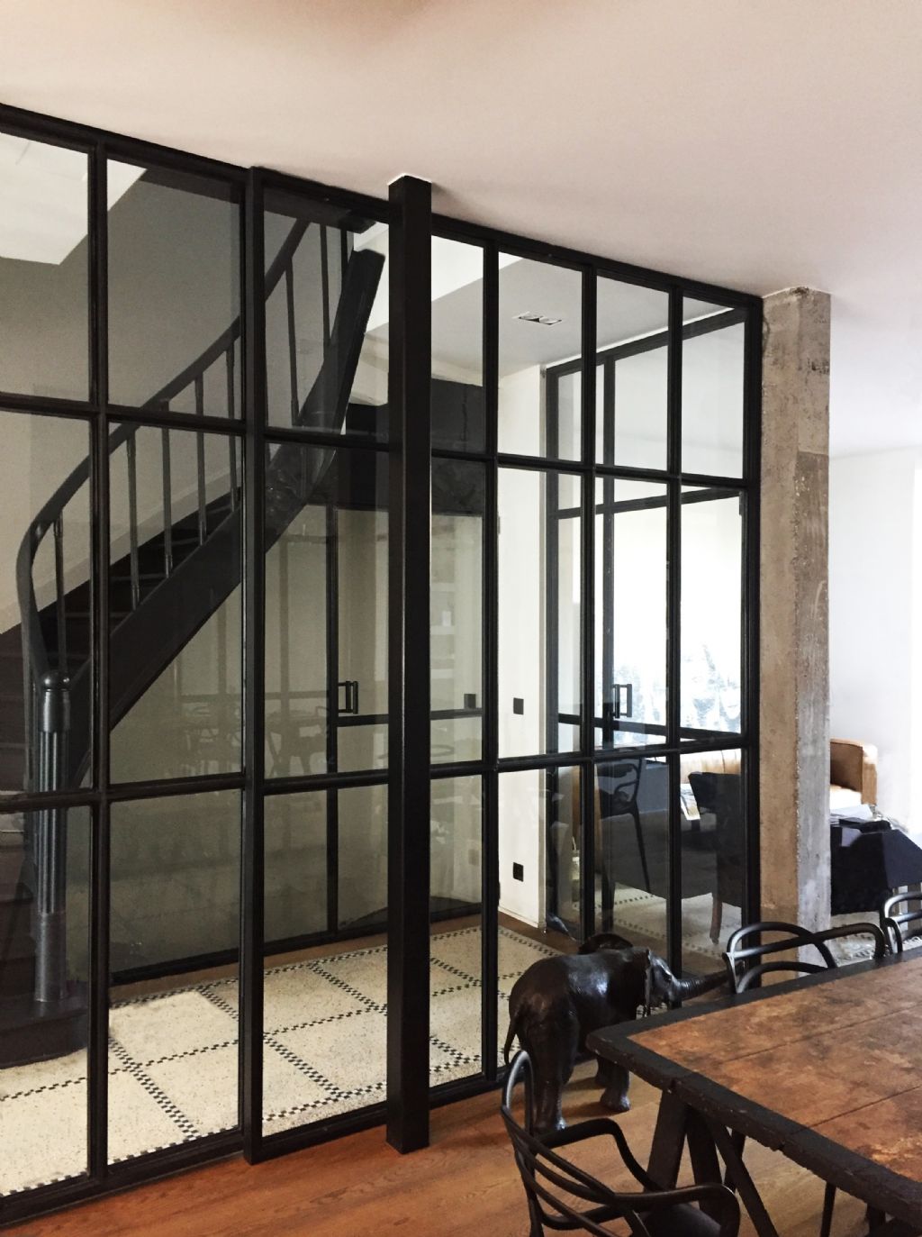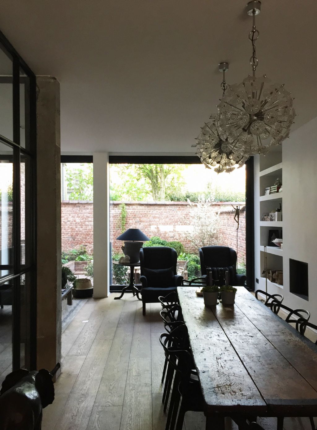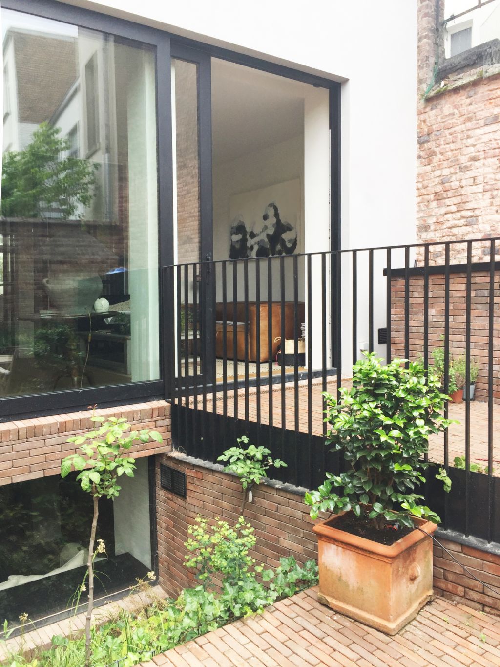 Dans le séjour du rez, une relation privilégiée est établie avec la cour qui est transformée en jardin contre le mur d’enceinte et en une terrasse en creuset pour libérer la vue de tout mobilier extérieur. Le niveau inférieur, depuis la salle de jeux des enfants, profite également de la modification du sol pour bénéficier de lumière et de la vue vers un talus planté. A l’intérieur, les matières et ouvrages d’époque sont conservés et restaurés : l’escalier en bois à double quartier tournant, les planchers en bois, le granito du rez, les maçonneries. Telle de la marqueterie, les nouveaux matériaux sont incrustés dans l’existant. A l’extérieur, le vert dans l’âme, le fer comme trame, les éléments du projet s’articulent autour du vivant (plantations et petite faune associée) et de matériaux traditionnels (verre, acier, brique et enduit). La coupe quant à elle exprime les cadrages et les relations visuelles intérieures et extérieures, les reculs formant les plateformes plantées aux troisième et quatrième étages, les variations des niveaux du jardin en terrasses entre le rez et le premier étage. Certaines baies sont augmentées ou créées pour cadrer des vues et apporter de la lumière. Un nouveau puits de lumière transforme l’escalier et ses paliers en lieu à part entière. Le coeur de l’espace de circulation, sombre à l’origine, est baigné de lumière depuis le troisième étage jusqu’au rez. Autour de cette centralité verticale, des cloisons vitrées offrent une clarté supplémentaire dans le séjour et le vestibule. En ce sens, le projet s’affirme dans une relation intro/extravertie avec l’espace public.