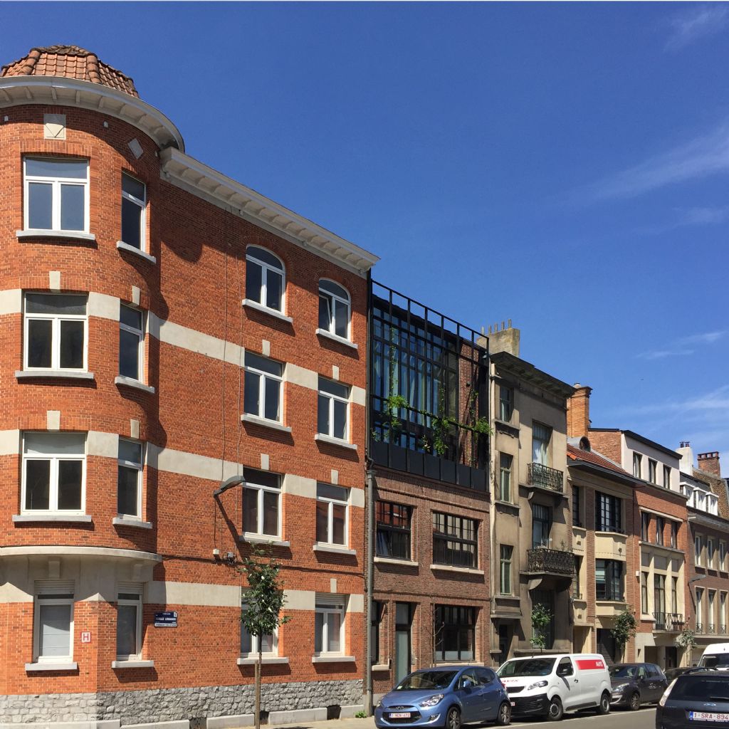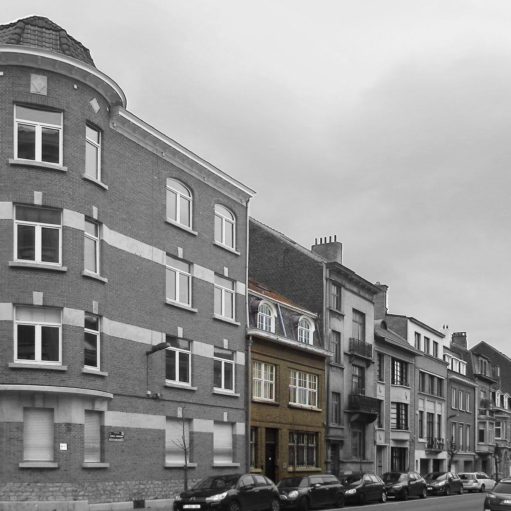 Dans un quartier résidentiel d’Ixelles, en retrait des grands axes, l’habitation mitoyenne se situe dans un îlot présentant de généreux et profonds jardins, à l’exception des bâtiments d’angles et ceux contigus. Côté rue, à la demande du service urbanisme, la façade d’origine de 1928 est conservée jusqu’à ses menuiseries. Le bien est flanqué de part et d’autre de deux grands immeubles d’écritures différentes. Le tout forme un ensemble éclectique avec des variations de hauteur significatives. Le logement dispose d’un sous-sol, d’une petite cour arrière, de quatre niveaux dont deux sous les combles. Les espaces sous toiture ne sont pas d’origine et forment un véritable noeud sans structure ni qualité.