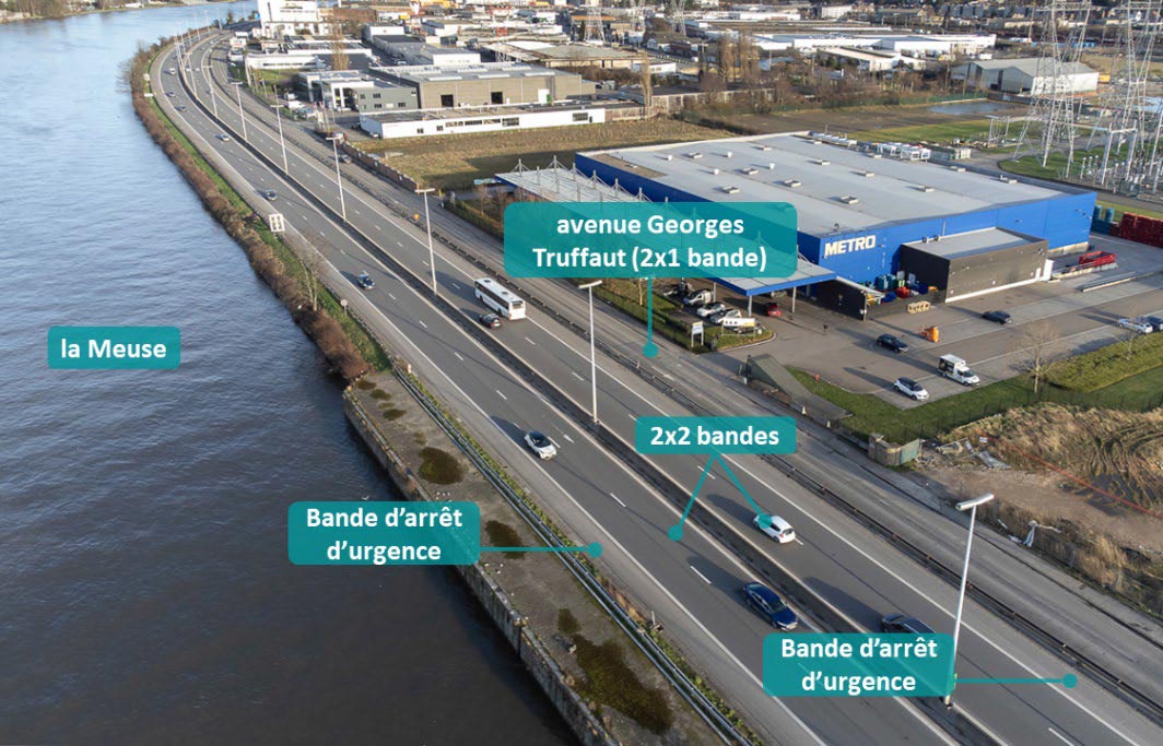 L’autoroute E25/A25 existante dispose de 2x2 voies avec bande d’arrêt d’urgence. Cette autoroute est longée par l’avenue Georges Truffaut disposant de 2x1 voie. De l’autre côté, l’autoroute est longée par le fleuve, la Meuse.