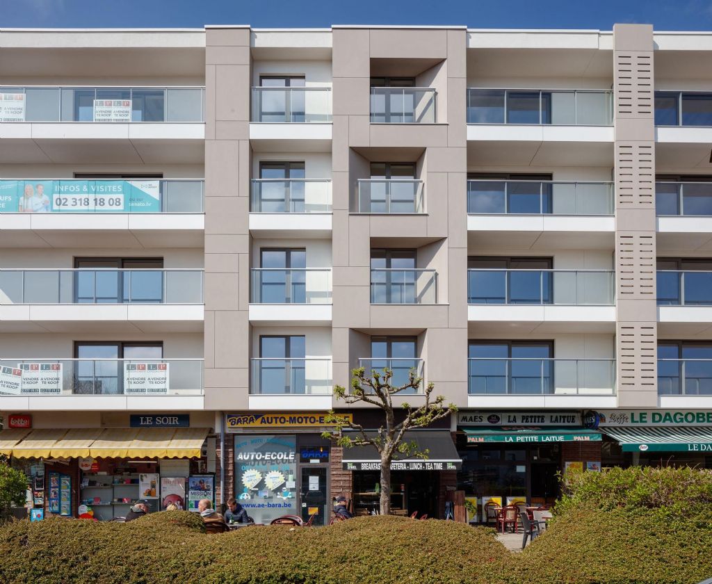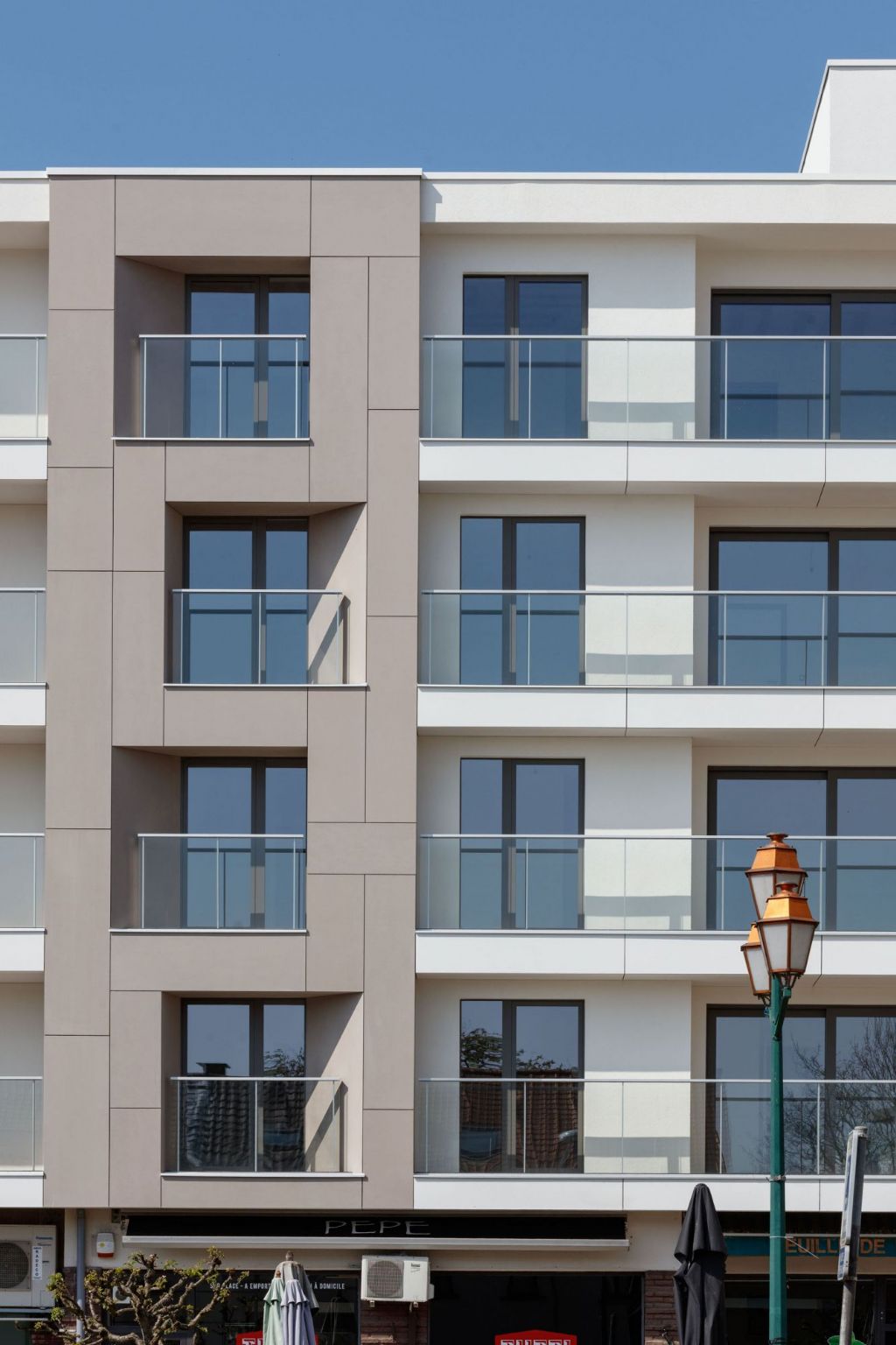 La façade a été travaillée dans son épaisseur. « Les saillies sont bardées de panneaux en fibrociment de teinte moyenne, en contraste avec les teintes claires en arrière-plan. Un rythme vertical dynamise la façade. Les logements sont quant à eux organisés autour de la circulation centrale existante qui a été maintenue. » Vingt nouveaux parkings ont également été créés au rez-de-chaussée et au 1e étage du bâtiment. « Une extension a été construite au 1er étage, sur le triangle de terrain contenu entre le bâtiment existant et les maisons voisines situées en hauteur le long de la rue Felix Poels, afin de pouvoir accéder aux parkings nouvellement créés. Une nouvelle ventilation des parkings existants a été mise en place et un nouveau groupe de ventilation double flux a été prévu en toiture pour les logements. » On a posé sur les toitures une membrane epdm sur des panneaux d’isolation en mousse polyuréthane. Ces toitures seront végétalisées et on y accèdera via les terrasses des logements attenants.
