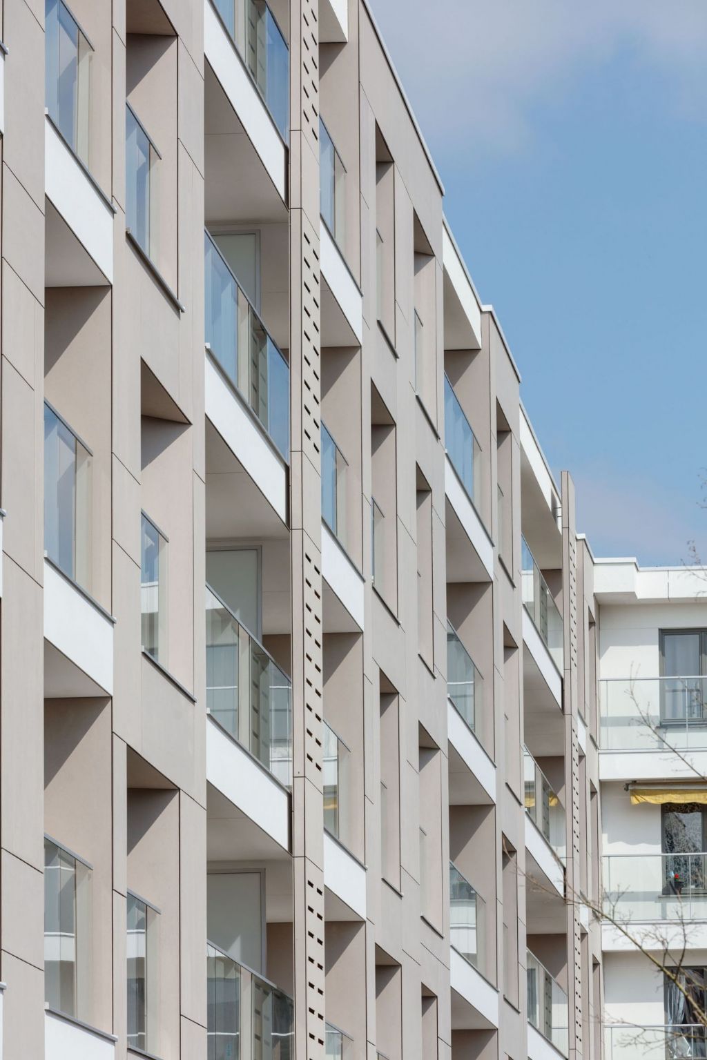 L’aile B a par contre été complètement rénovée. Le gros œuvre a été mis à nu et le bâtiment a été équipé de nouvelles installations techniques. « Ses performances énergétiques et acoustiques ont été considérablement améliorées », précise-t-on chez FORMa*. Les façades sont isolées et enduites de crépi sur une isolation en polystyrène expansé. Les châssis ont été remplacés par de nouveaux châssis plus performants, avec des profilés en aluminium laqué thermo-coupé et un double vitrage clair isolant. Les balcons ont été remis à neuf et sont désormais pourvus de planchers en bois, les rives et les sous-faces étant bardées de panneaux de fibrociment. Ces balcons disposent également de nouveaux garde-corps en verre.