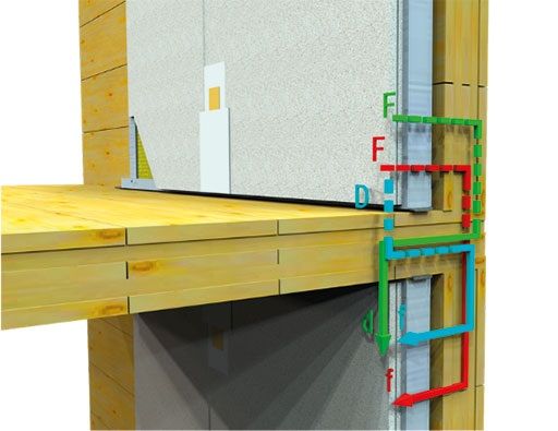 Outre la voie de transmission directe Dd (non représentée sur la figure), douze voies de transmission latérale sont possibles entre deux locaux superposés. En effet, il existe quatre nœuds constructifs avec, pour chacun, trois voies de transmission latérale (Ff, Fd et Df, voir figure 1). F et D désignent respectivement la paroi latérale et le plancher de séparation du côté où le bruit est émis, et f et d la paroi et le plancher du côté où le bruit est perçu.