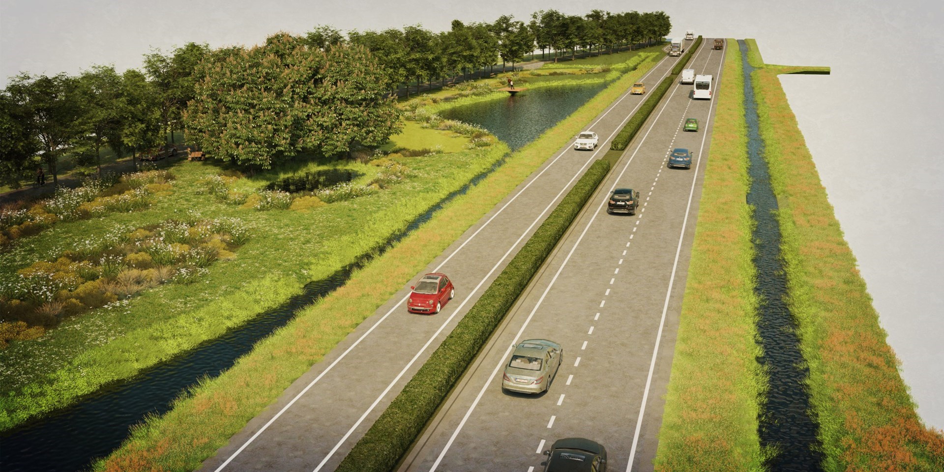 La conception prévoit de replanter les rangées d’arbres caractéristiques de la chaussée Ypres-Furnes, qui ont largement disparu au cours du siècle dernier, avec un mélange d’arbres résistants au climat. En outre, de la verdure locale sera plantée autour des bassins tampons et la nature de la vallée de l’Yser sera restaurée. La future N8 sera ainsi bordée de verdure sur toute sa longueur, ce qui permettra à la nature de s’épanouir.