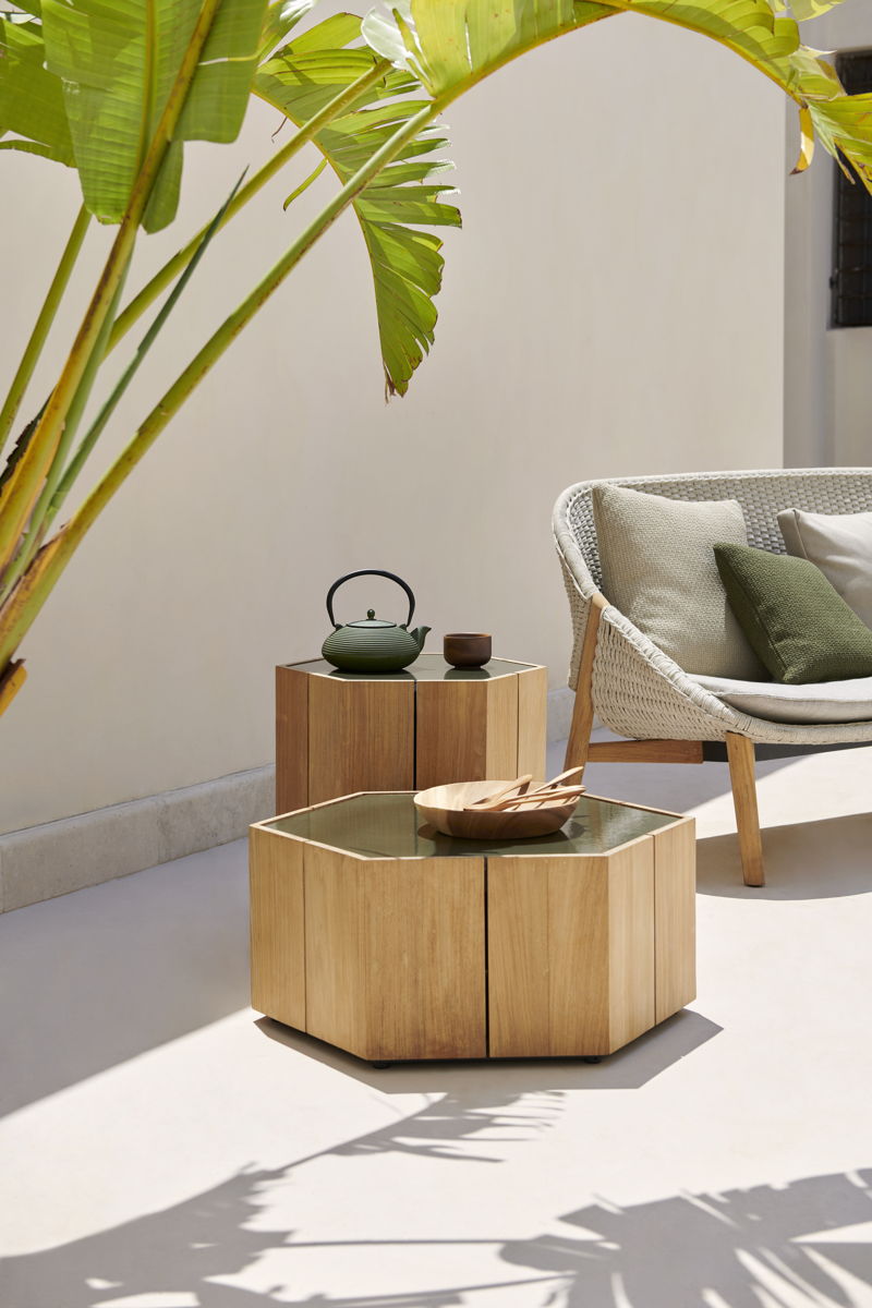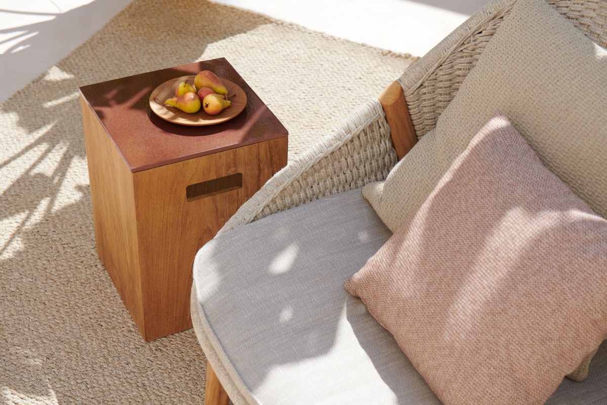 La base de la nouvelle table d’appoint Tairu est formée par un solide rectangle creux en teck. Le plateau réalisé en pierre de lave du Vésuve fait la particularité de chaque table. La finition émaillée appliquée manuellement à l’éponge naturelle nuance la couleur en fonction du reflet de la lumière sur le plateau. En cas de visite imprévue, vous pouvez facilement déplacer la table grâce aux poignées intégrées. Les plateaux sont disponibles en quatre teintes sophistiquées, chacune dans une finition craquelée subtile.