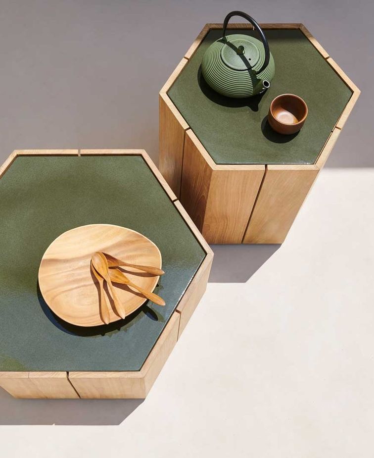 Cette saison, les tables Hexagon conçues par Marc Merckx seront également disponibles dans les nouvelles couleurs Moss et Burgundy. Le plateau de la table Hexagon est réalisé dans une pierre de lave émaillée dont les imperfections naturelles sont mises en valeur par l’effet craquelé. La couche d’émail permet à la pierre naturelle de résister à l’eau, à la chaleur, au gel, aux UV et aux taches.