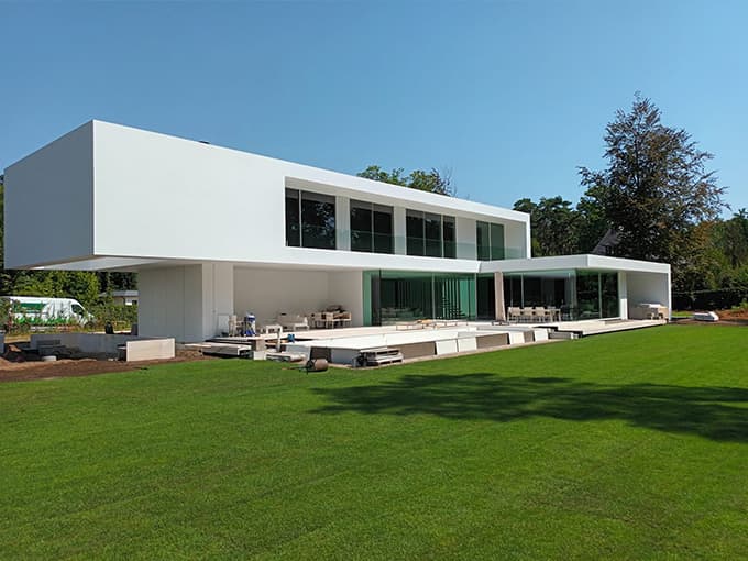 Le design moderne est évident. L'utilisation d'ETICS permet d'obtenir des formes cubiques précises et des surfaces rectangulaires sans interruption, ainsi qu'une finition lisse et élégante. Pour permettre et soutenir cette apparence, deux détails méritent d'être mentionnés : les avant-toits invisibles ont été rendus possibles par un profil Willco Products ProAttika®. Ce profil devient invisible après le traitement. Le profil permet d'appliquer la couche de finition d'un système ETICS, à savoir un crépi décoratif, jusqu'au sommet de la surface du pignon. Comme la couche de finition s'étend sur toute la surface, on obtient l'aspect d'une façade sans avant-toit. Cet effet donne une finition élégante et exclusive à la maison ! En outre, pour obtenir une toiture plus fine, une isolation sous vide a été utilisée en combinaison avec du polystyrène expansé de haute qualité au niveau des plafonds.