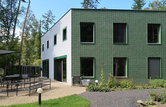 Le bâtiment est hexagonal et accueille 9 résidents adultes qui y vivent sous surveillance. Ils disposent chacun d’un studio privé moderne de 30 m² et partagent une grande salle à manger et un salon communs. La vie prime sur les soins, c’est pourquoi la Villa Kameleon ne ressemble en rien à un centre de soins classique. Ici, pas de longs couloirs ni de pièces rectangulaires : chaque chambre est située dans l’un des six coins du bâtiment, ce qui permet à chaque résident d’avoir deux vues différentes sur le paysage environnant. Grâce au puits de lumière central, le bâtiment bénéficie d'une lumière naturelle abondante. La forme hexagonale du bâtiment le fait paraître délibérément plus petit qu'il ne l'est. En raison de son emplacement dans une clairière de la zone boisée, la Villa Kameleon se camoufle presque comme l'animal du même nom. Des carreaux de céramique verts en trois nuances alternent avec un crépi décoratif brillant à grain fin.