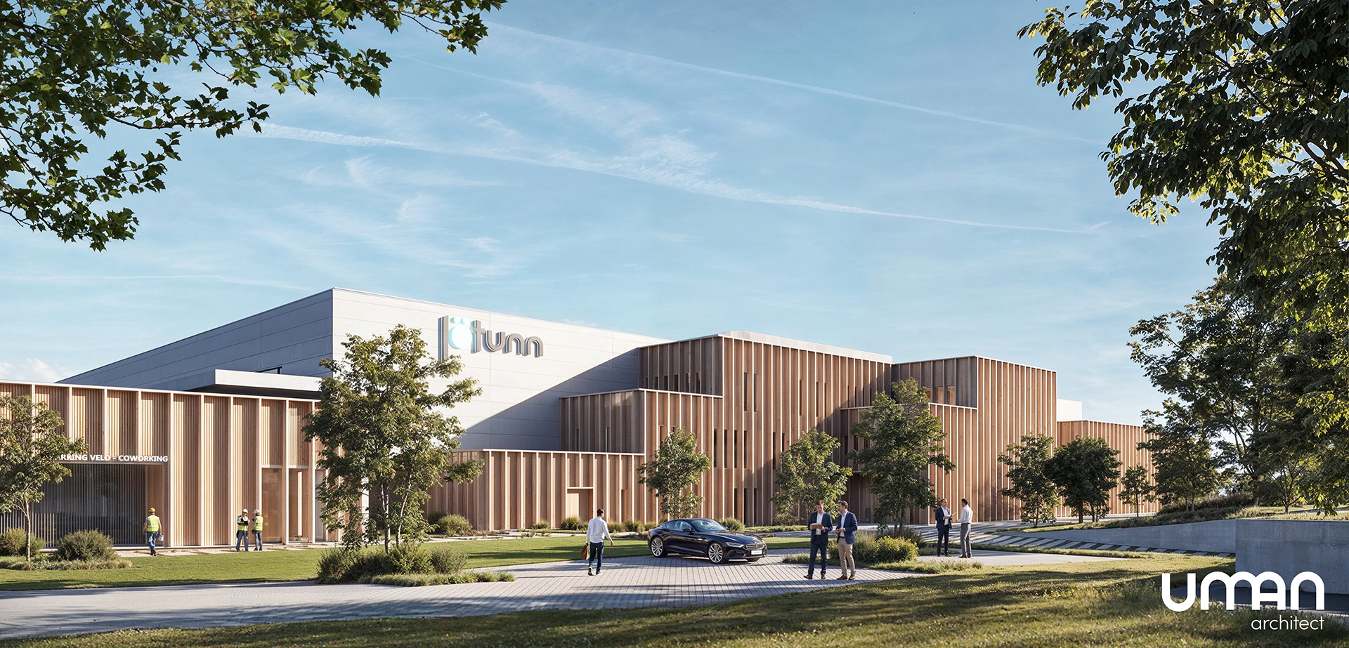 Le projet comprend deux halls industriels de 12 000 m² et 2 000 m² dédiés à la production. Il intègre également un bâtiment de bureaux réparti sur trois niveaux, un espace de coworking et des aménagements extérieurs. L’ensemble est conçu pour articuler activités industrielles et espaces de travail.