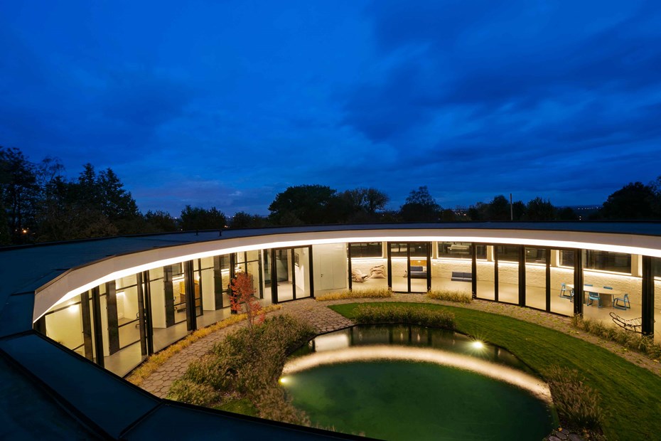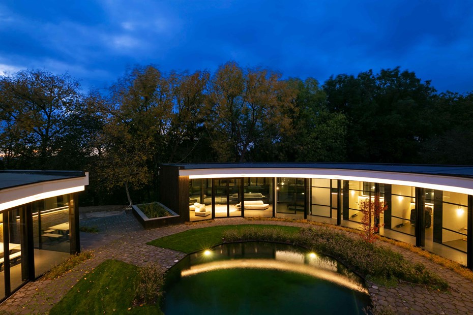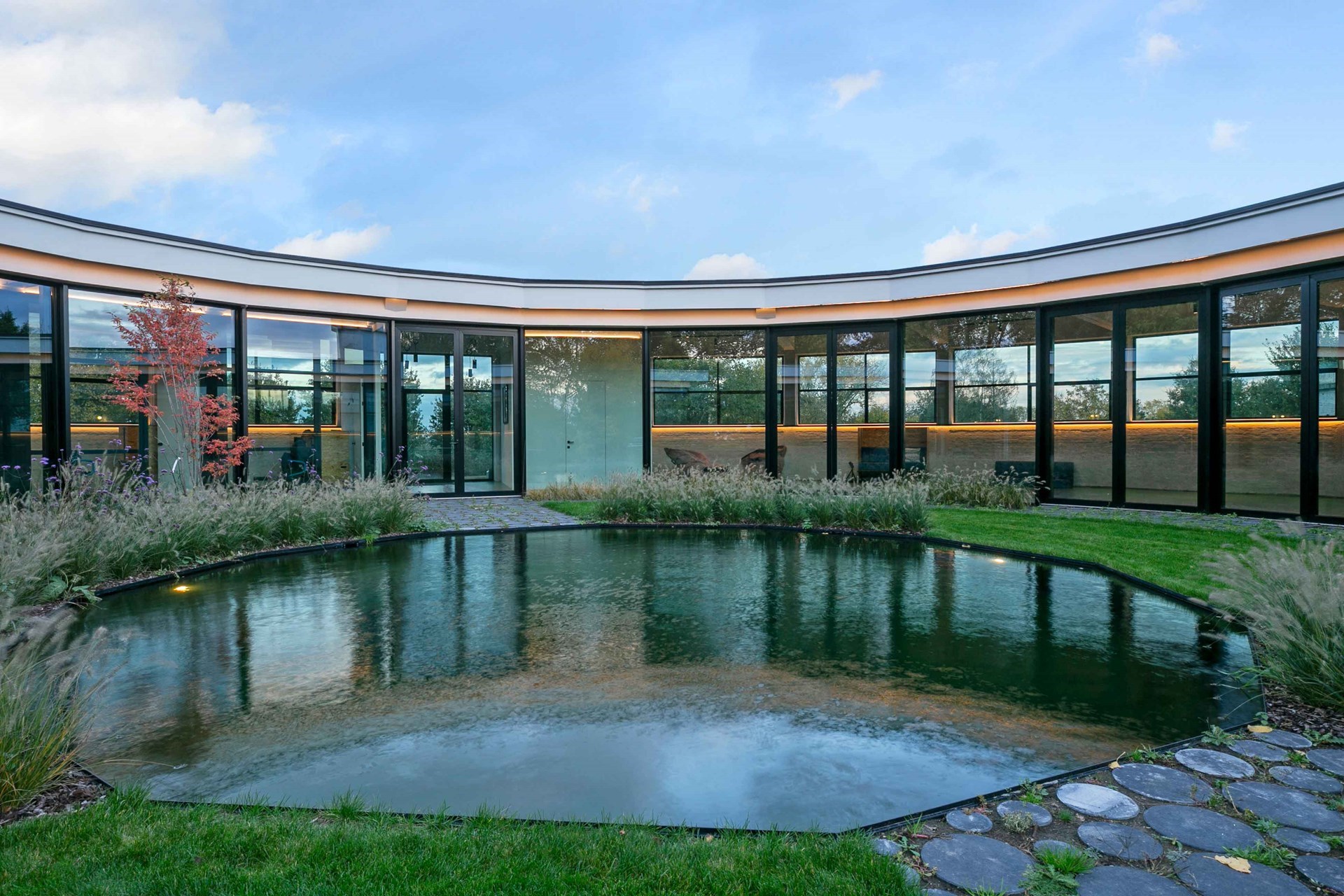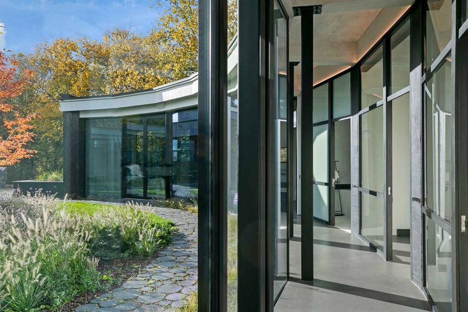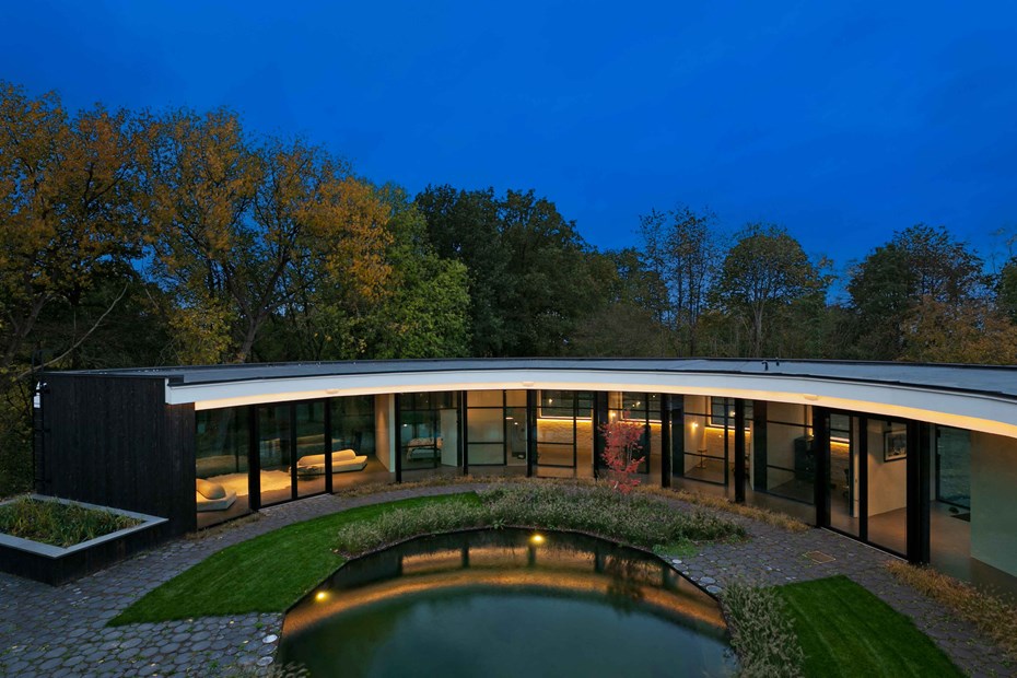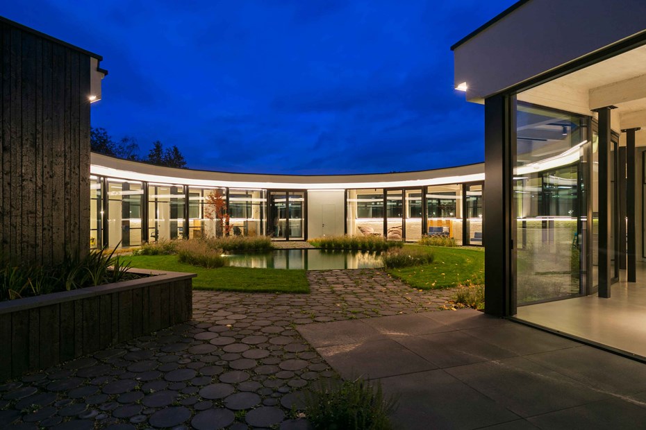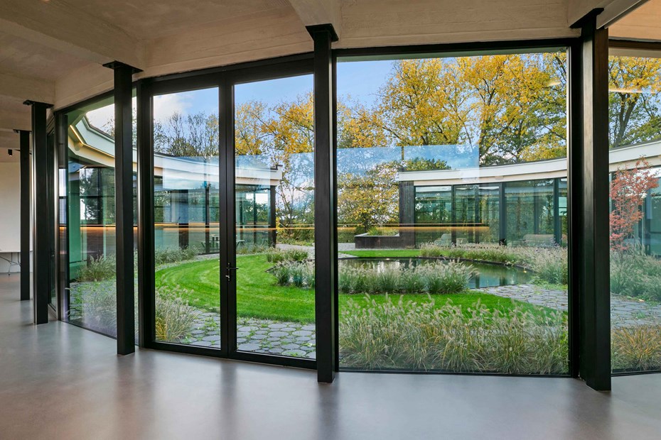 Les murs du côté du patio ont été enlevés et remplacés par du verre. Le bâtiment est ainsi intégré dans la réserve naturelle brute à l'extérieur et dans le jardin culturel strictement organisé à l'intérieur du cercle.