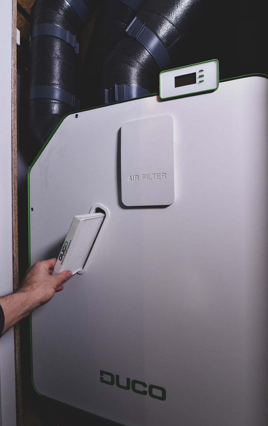 Richard Geraerts, Directeur des ventes chez Duco, explique : « Le fait que ce bâtiment soit classé a compliqué le choix du bon système de ventilation, surtout du fait qu'il fallait également tenir compte des facteurs esthétiques. Il n’était pas possible d’utiliser un système de ventilation naturelle du fait que la façade du monument était protégée. C’est pourquoi nous avons décidé d’utiliser un système D, c’est-à-dire la DucoBox Energy, avec régulation à deux zones. Cette VMC double flux avec deux zones différencie la partie salon et la partie chambres, afin d’améliorer les prestations énergétiques. À l’aide de capteurs, le système suit en effet les mouvements de l’habitant dans la maison et détermine ainsi automatiquement à quel moment la ventilation doit être activée. Ceci permet d’économiser sur les coûts énergétiques et de contribuer à la réduction des émissions de CO2 au niveau mondial. »