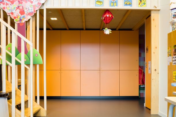 Dans l'école primaire de Stasegem, Demecoplaf, entreprise spécialisée dans les finitions, a utilisé le produit acoustique innovant de type I (Invisible) avec une couche supérieure de vinyle tissé en couleur Adanna à l’entrée et dans la salle polyvalente. Pour l'architecte d’intérieur Labonorm, qui a réalisé et installé les meubles personnalisés, Print Acoustics a fourni des portes d'armoire type M dans diverses couleurs (uni et imitation bois), avec chants assortis ABS. Ces portes d’armoires corrigent la réverbération et garantissent également que le temps de réverbération dans les grandes classe demeure inférieur à la norme exigée.